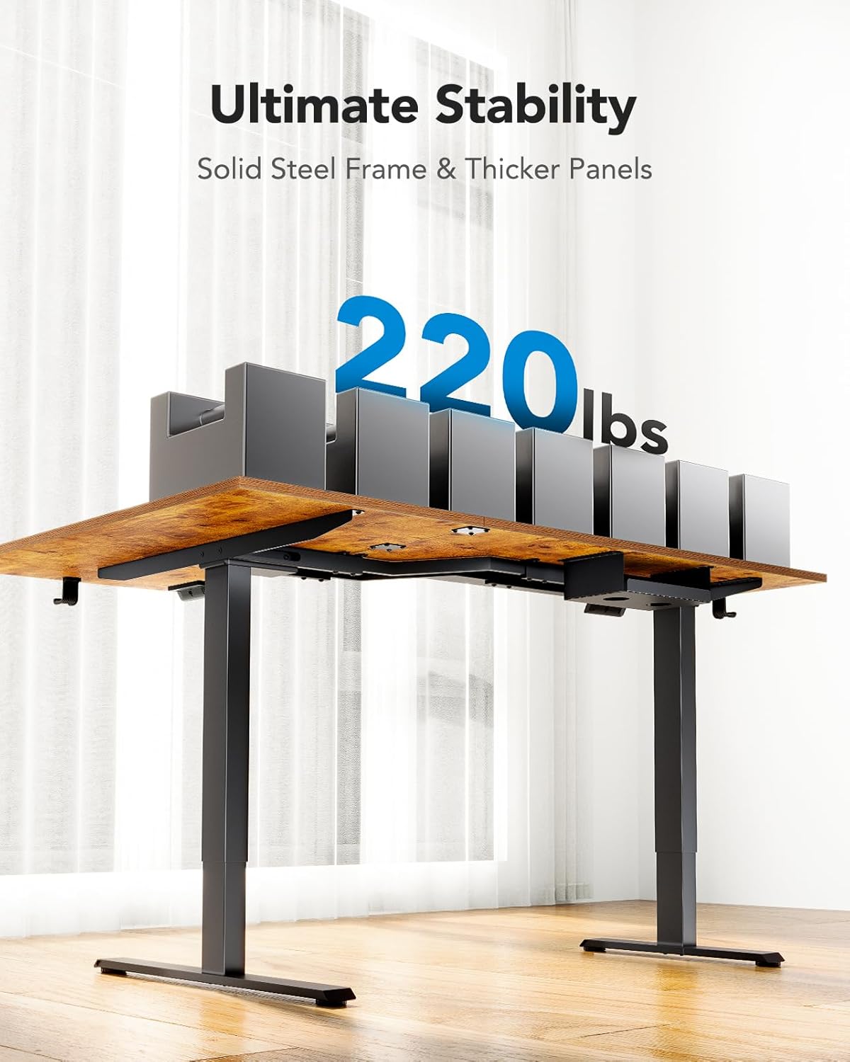 Customize your comfort with programmable height presets and. Built-in cable management trays help maintain a clutter-free desktop, while the premium wooden finish blends modern functionality with a sleek, professional look.