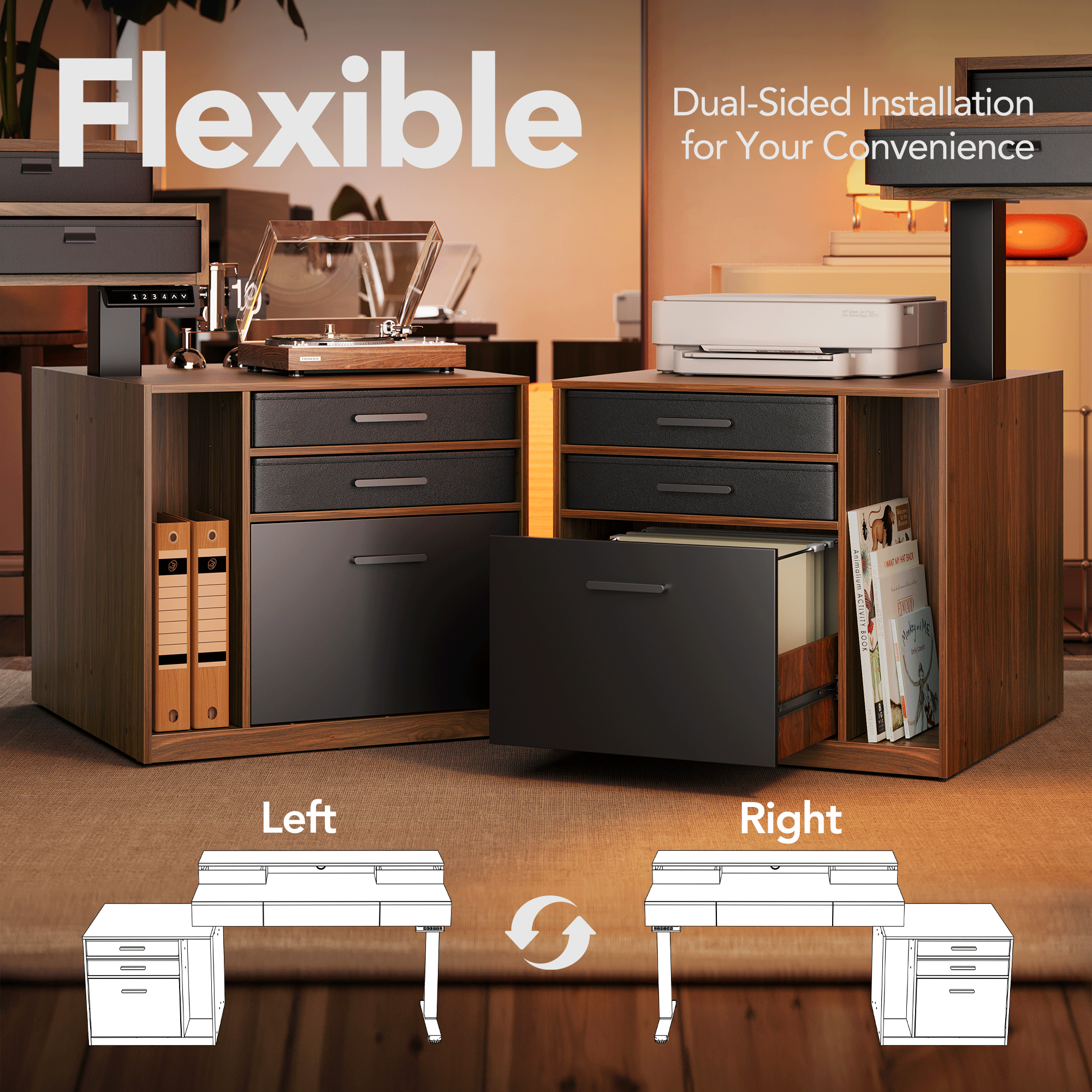 - Sleek Design:Featuring a rich walnut woodgrain surface paired with a matte black steel frame, this desk brings a professional and contemporary look to any home office or work environment. The contrast in texture and color enhances the premium feel while maintaining a minimalist design.