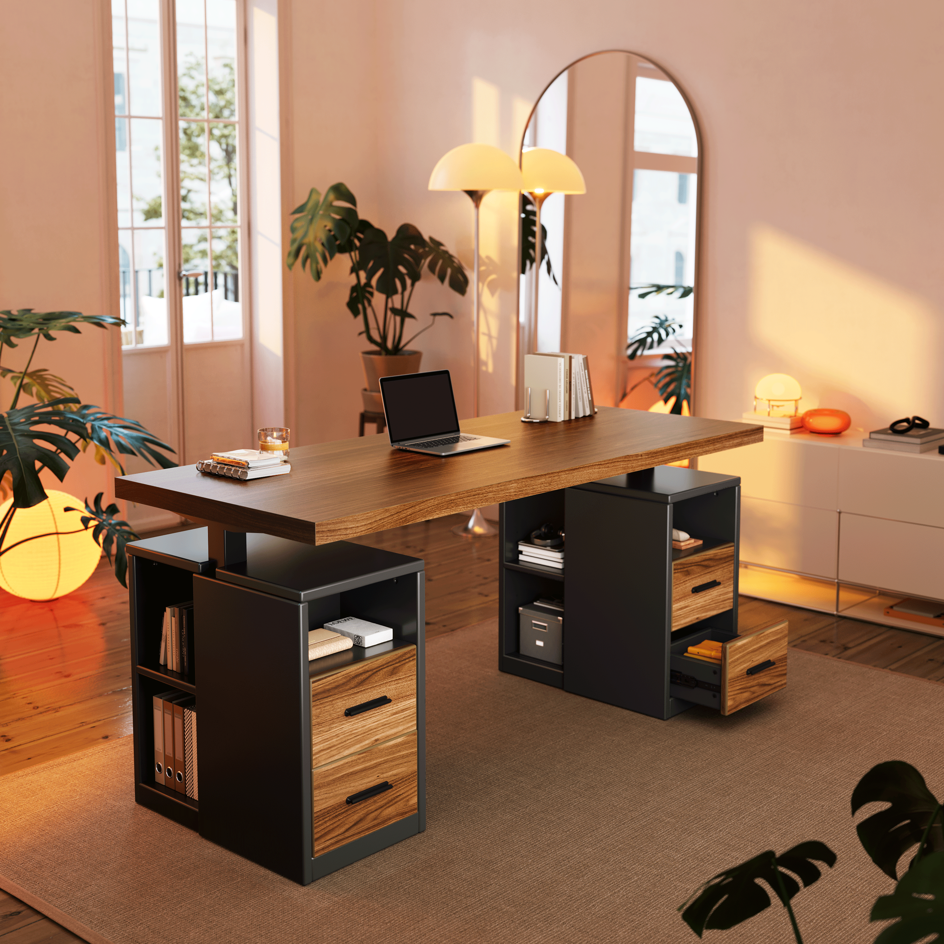 Stay organized with two spacious drawers and open shelving on both sides, designed to keep essentials within reach. Whether it’s office documents, notebooks, or personal items, you’ll enjoy a cleaner, clutter-free workspace that boosts focus and efficiency.