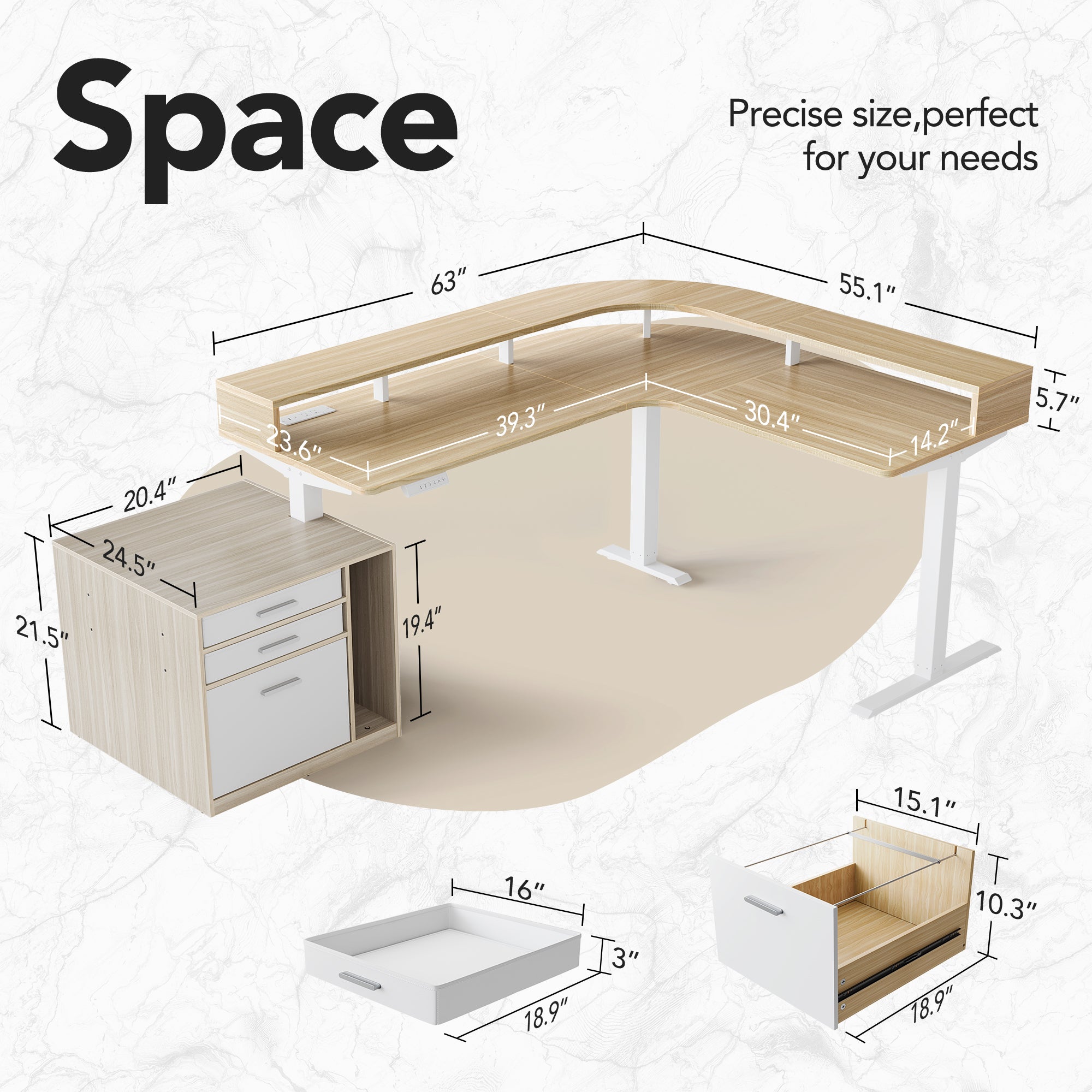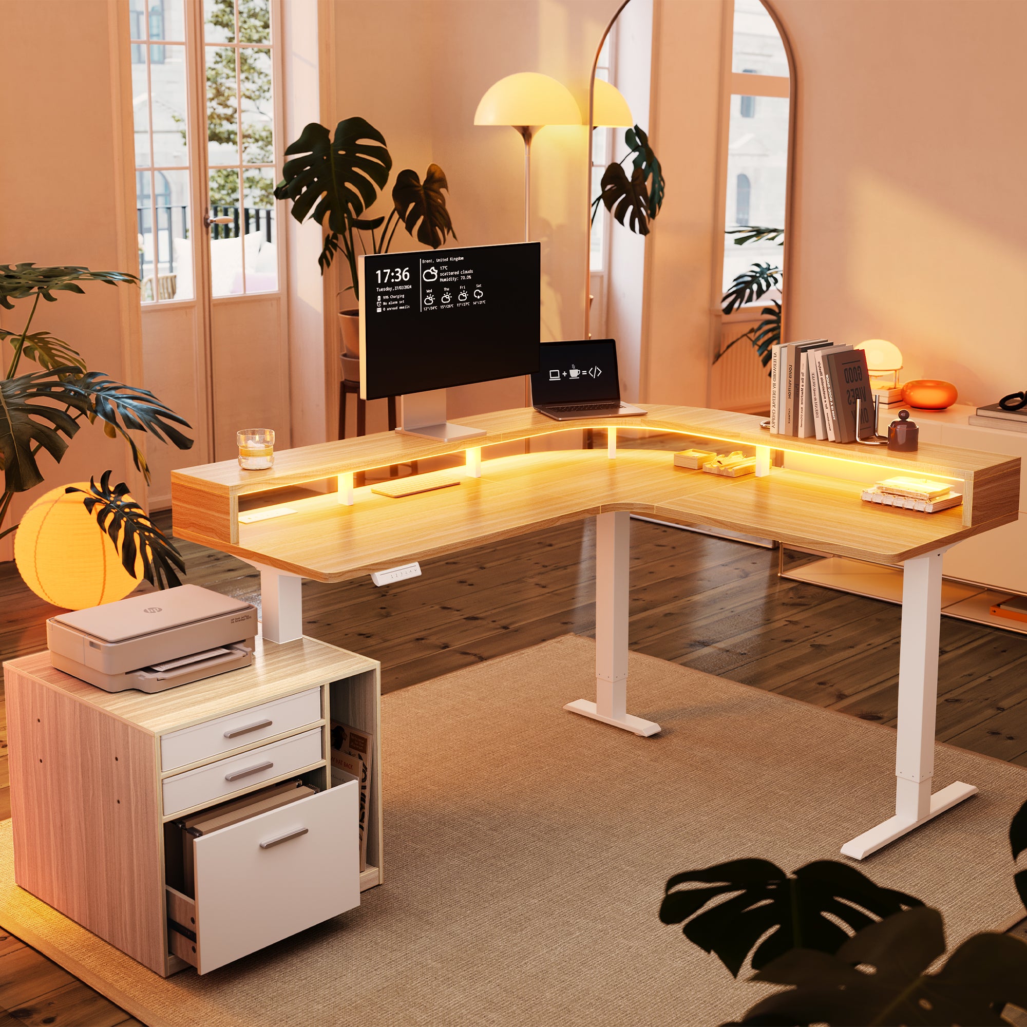 L-Shaped Electric Standing Desk with Integrated LED Lighting, Nested Storage Cabinet & Dual-Tier Surface