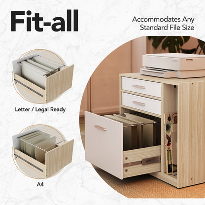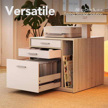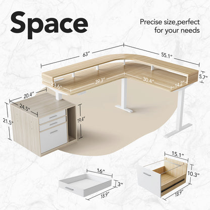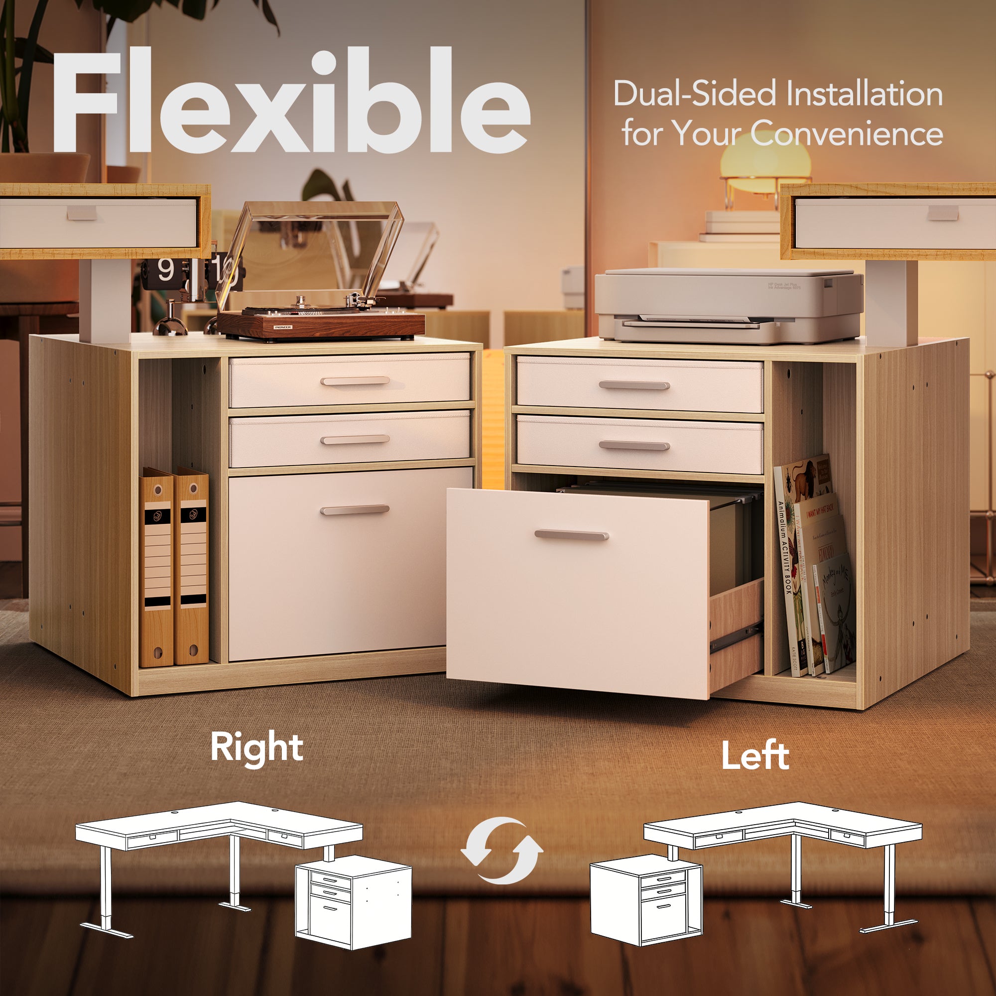 Maximized utility meets structural genius. We’ve replaced the traditional desk leg with a multifunctional wood storage pedestal. It features two utility drawers for office supplies, a deep file drawer for documents, and a side open cubby for extra accessibility. This heavy-duty cabinet acts as a solid anchor for the entire frame, providing superior stability compared to standard legs while keeping your essentials within arm’s reach.