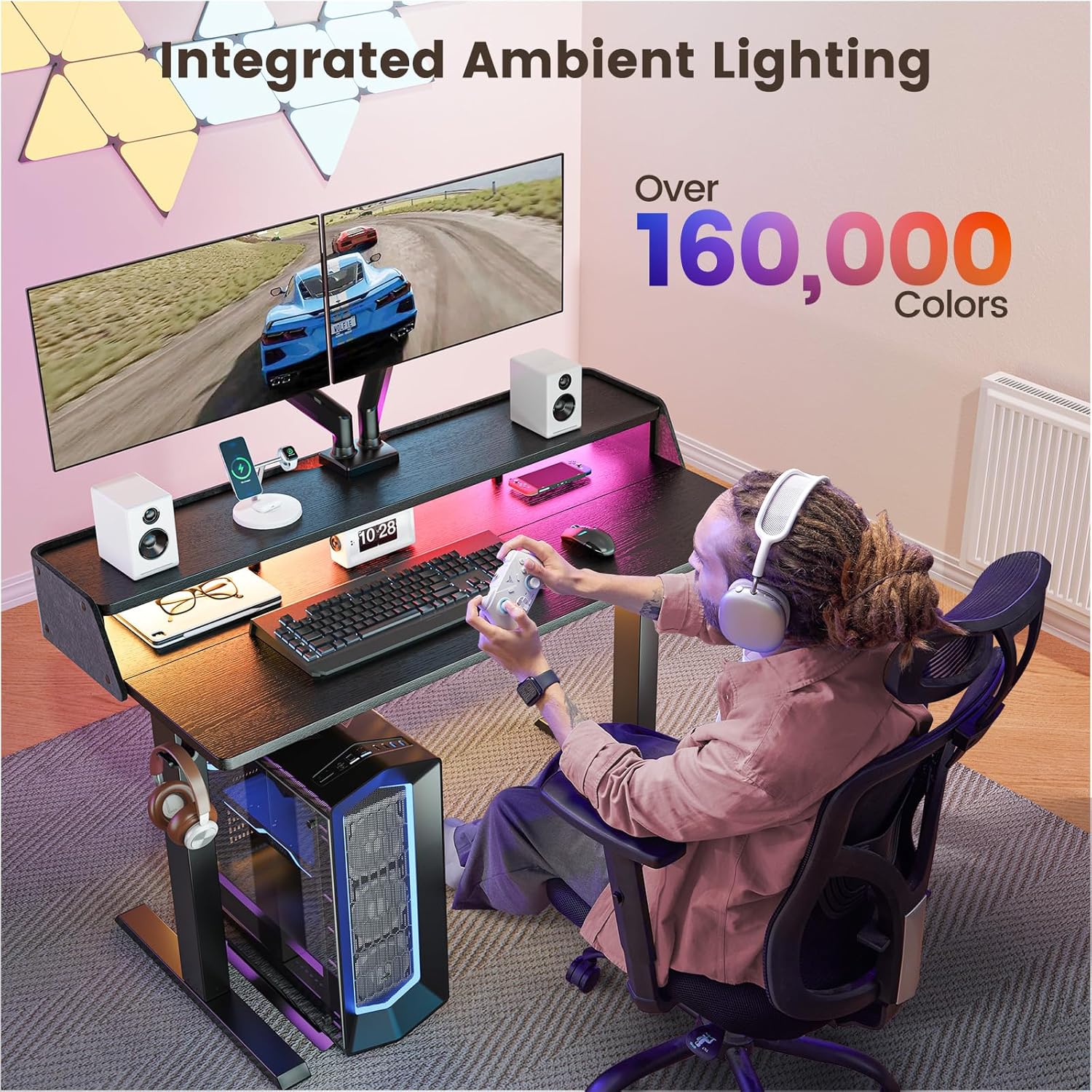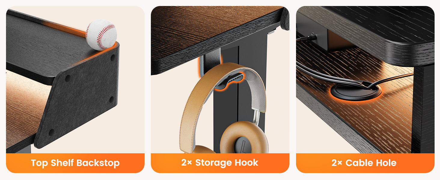 The top shelf backstop keeps books, monitors, or decor secure, while the 2 x storage hooks provide easy access to headphones, bags, or charging cables. Stay tangle-free with 2 x cable holes for seamless wire management, keeping your workspace clean and professional. this desk helps you stand tall, work better, and stay organized—whether you're working, gaming, or creating.