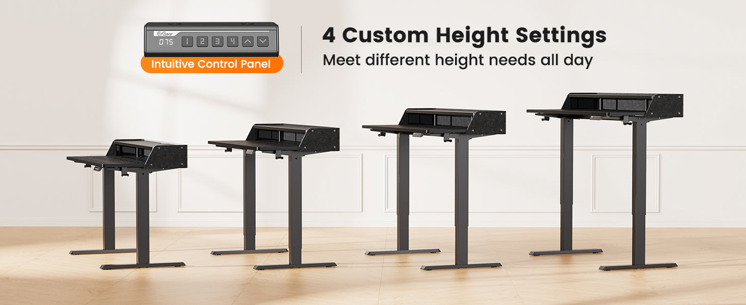 Our Electric Standing Desk features 4 customizable height settings to effortlessly adapt to your needs throughout the day – whether you're sitting, standing, or switching between tasks. The quiet, powerful motor provides smooth adjustments while the sturdy frame keeps your workspace stable at any level. Say goodbye to stiffness and hello to all-day comfort – stand tall, move freely, and work smarter with a desk that moves with you!