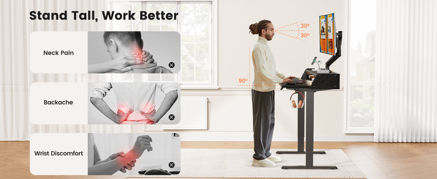 Tired of neck pain, backaches, and wrist discomfort? Our Electric Standing Desk helps you work better by promoting healthy posture and movement. With smooth height adjustment, you can easily switch between sitting and standing, keeping your spine aligned and your screen at eye level for a clear, ergonomic line of sight. Say goodbye to stiffness and fatigue—stand tall, move freely, and boost your focus and energy all day long!