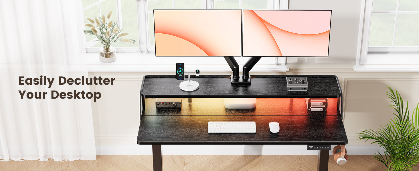 Upgrade your workspace with our Electric Standing Desk, designed to easily declutter your desktop while offering smooth height adjustment for ergonomic comfort. The clamp-on dual-arm display stand keeps your monitors, laptop, or accessories neatly organized, freeing up valuable desk space. Crafted from durable materials with a sleek modern design, this desk combines functionality and style—perfect for home offices, gaming setups, or creative studios. Boost productivity, reduce clutter, and work smarter!