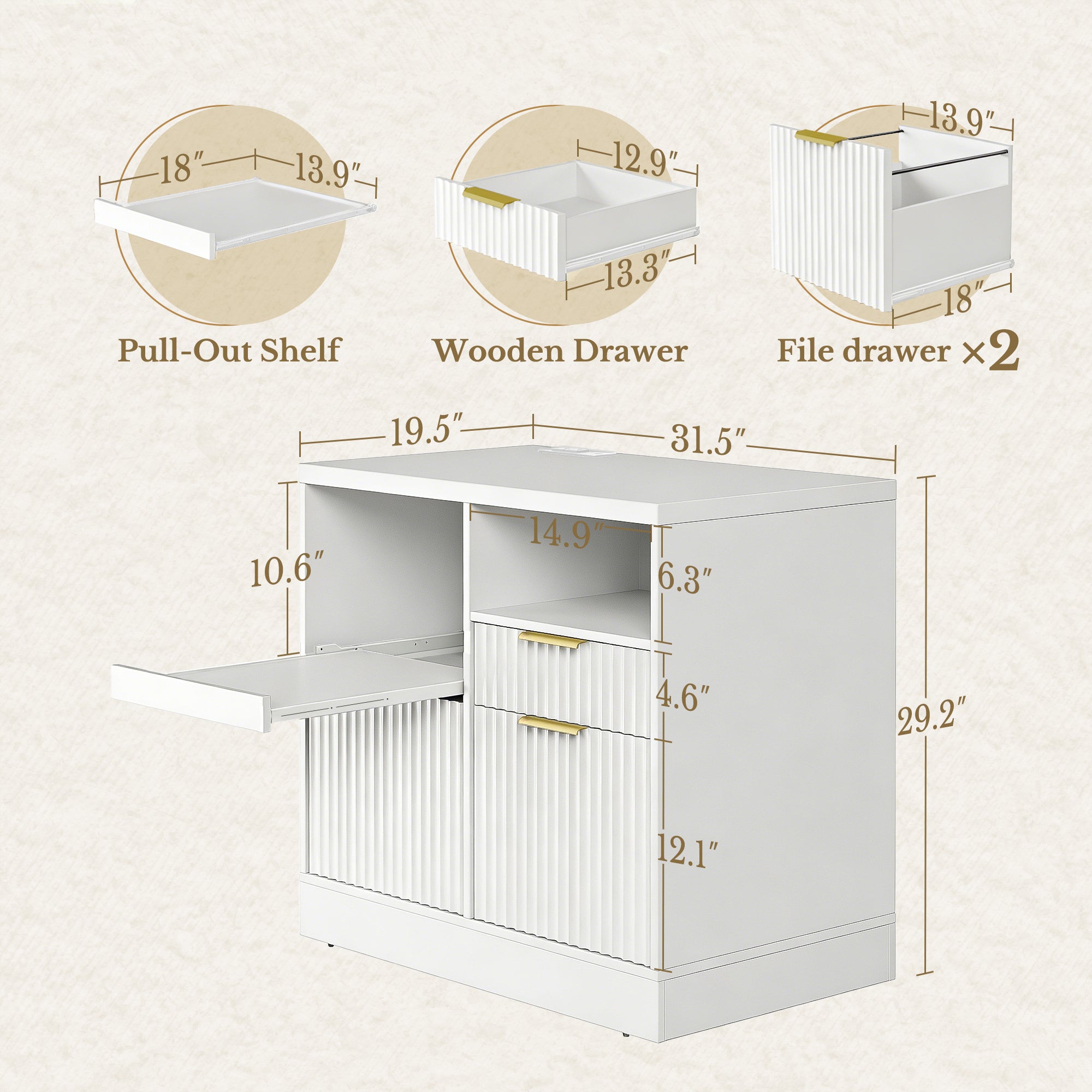 - File Drawers (x2): 13.9" W × 18" D; fits A4 & Letter hanging files