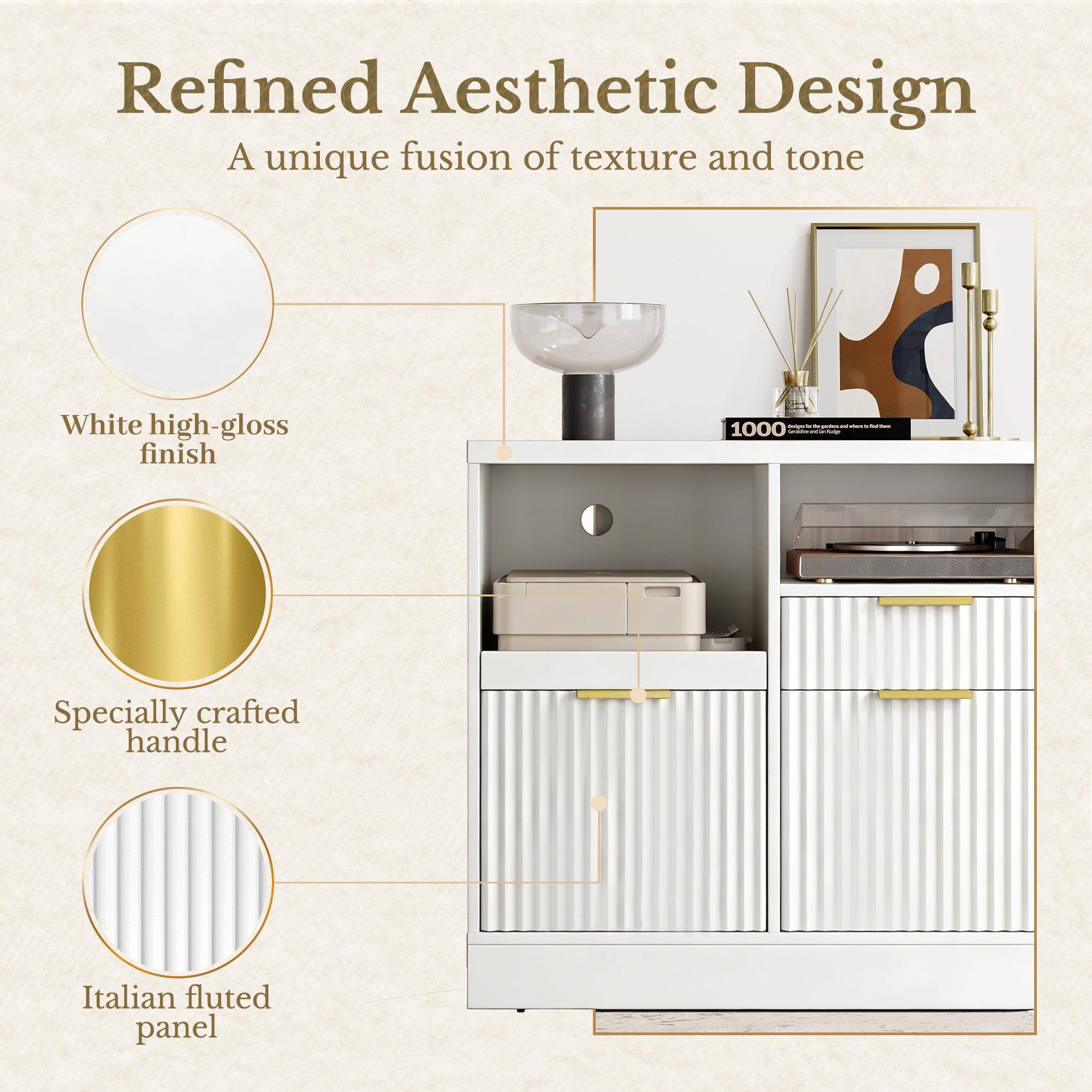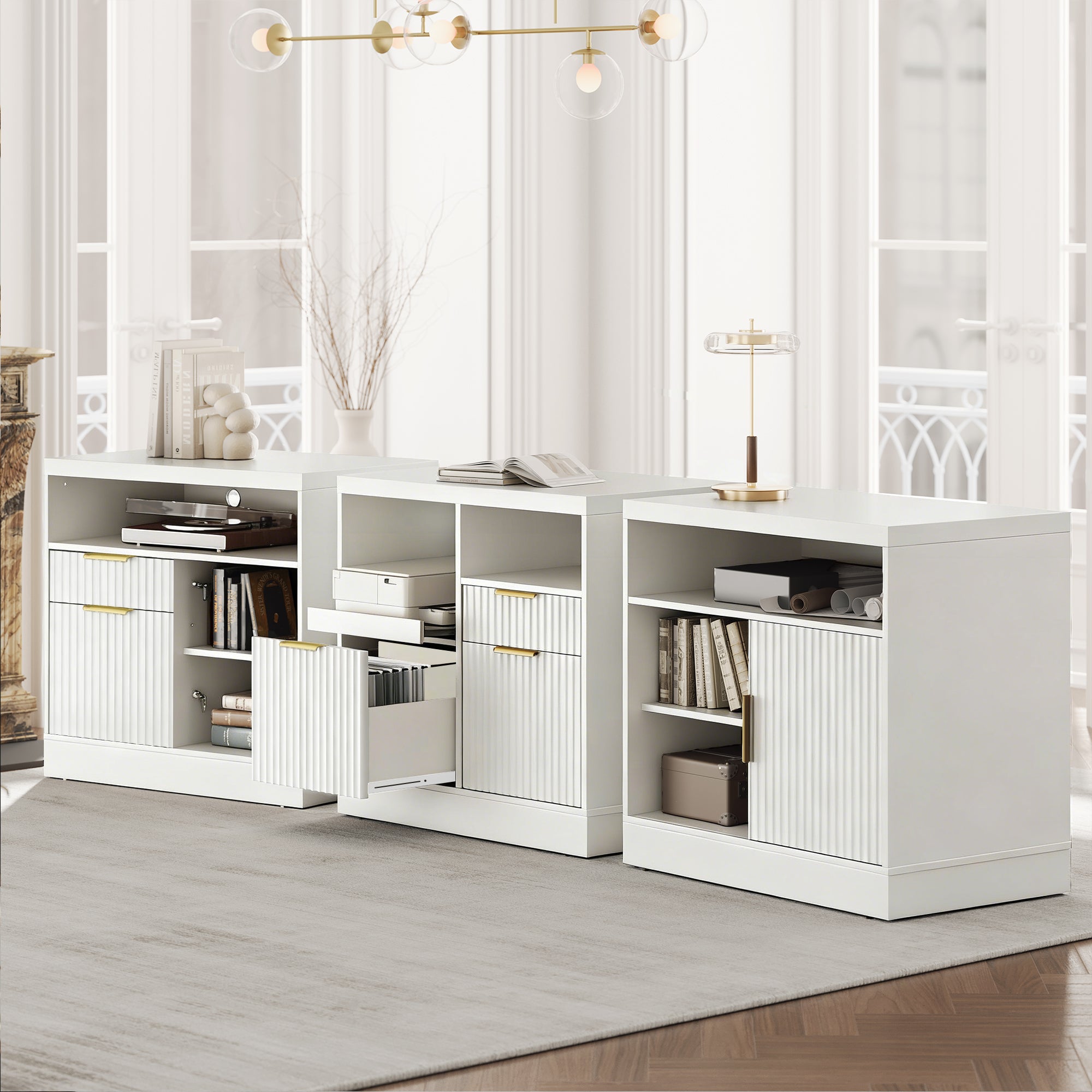- Refined fluted facade with metal handles: premium texture that elevates any workspace.