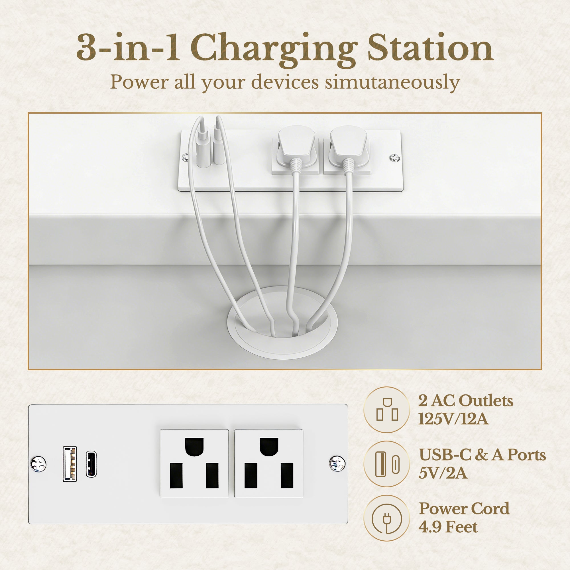 - Power: 2 AC outlets (125V/12A), 1 USB‑C + 1 USB‑A (5V/2A), 4.9 ft cord