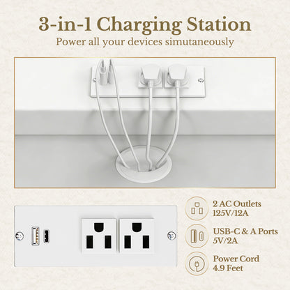 - 3‑in‑1 power hub: 2 AC outlets plus USB‑C & USB‑A (5V/2A) with 4.9 ft cord for instant charging.
