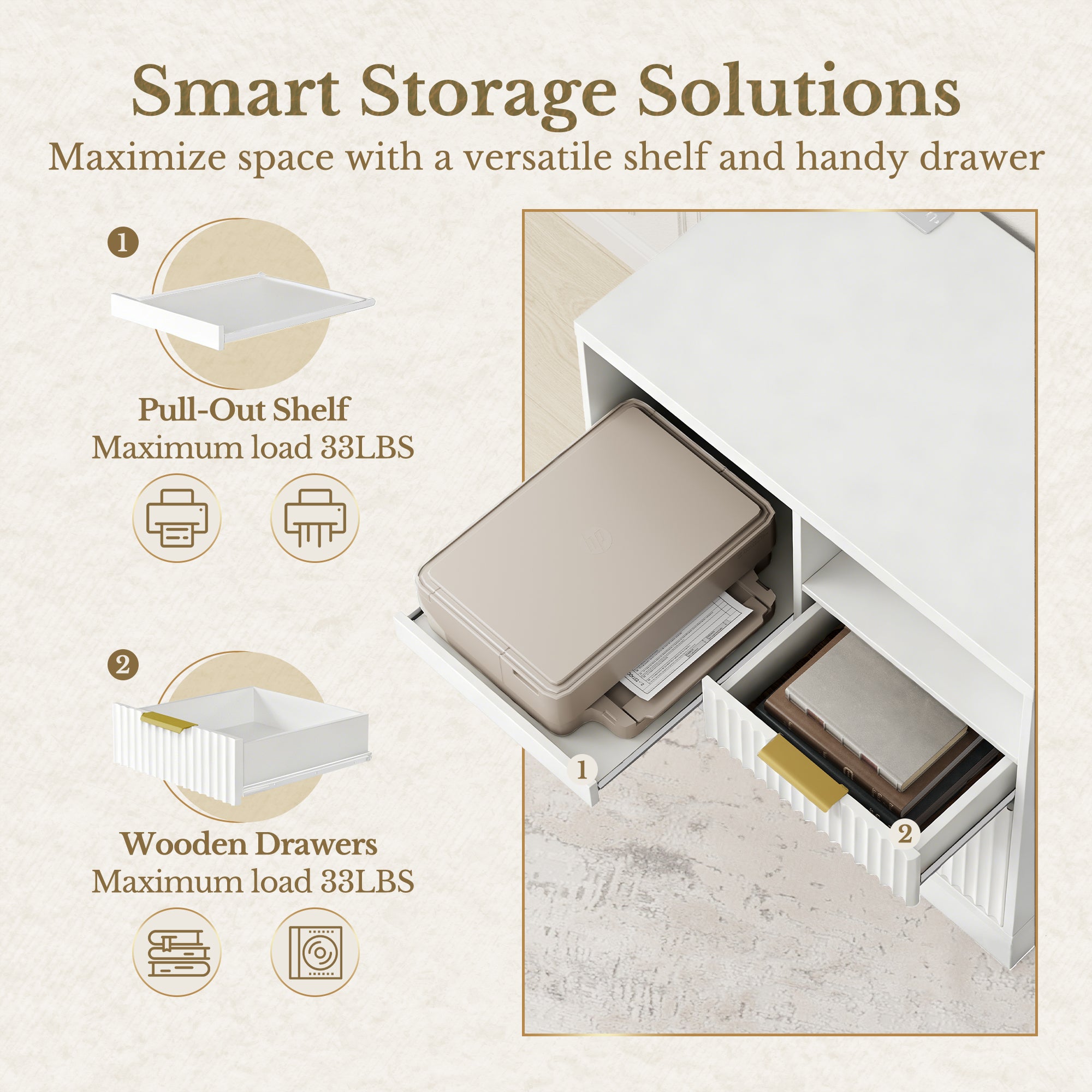 - Pull‑out printer shelf: smooth slide, easy access; rated up to 33 lbs.