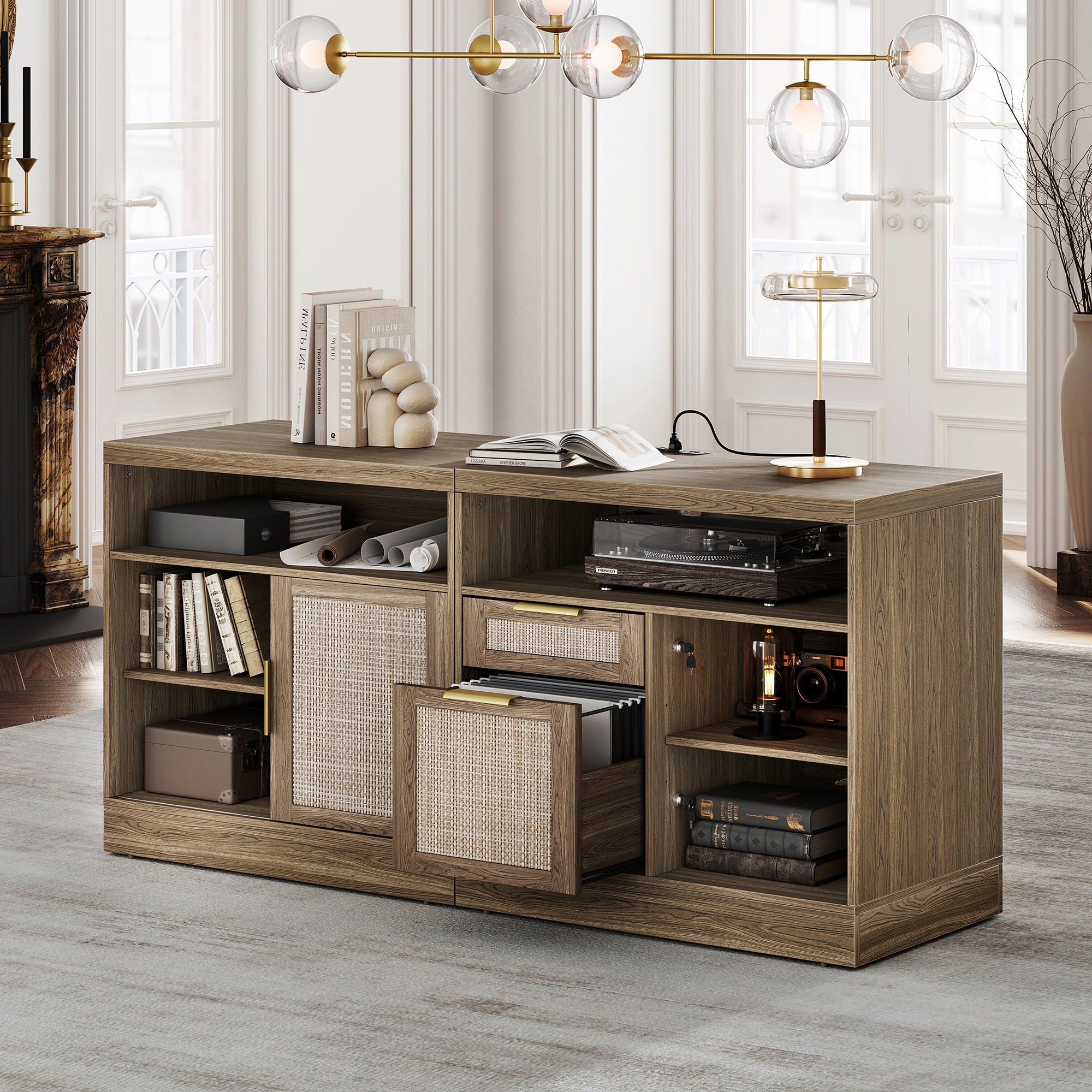 - Lateral File Cabinet with Charging Station: This cabinet features two power outlets, one USB port, and one Type-C charging port, allowing you to quickly charge your printer, scanner, smartphone, tablet, and other office electronics. It offers great convenience for your work and daily life.