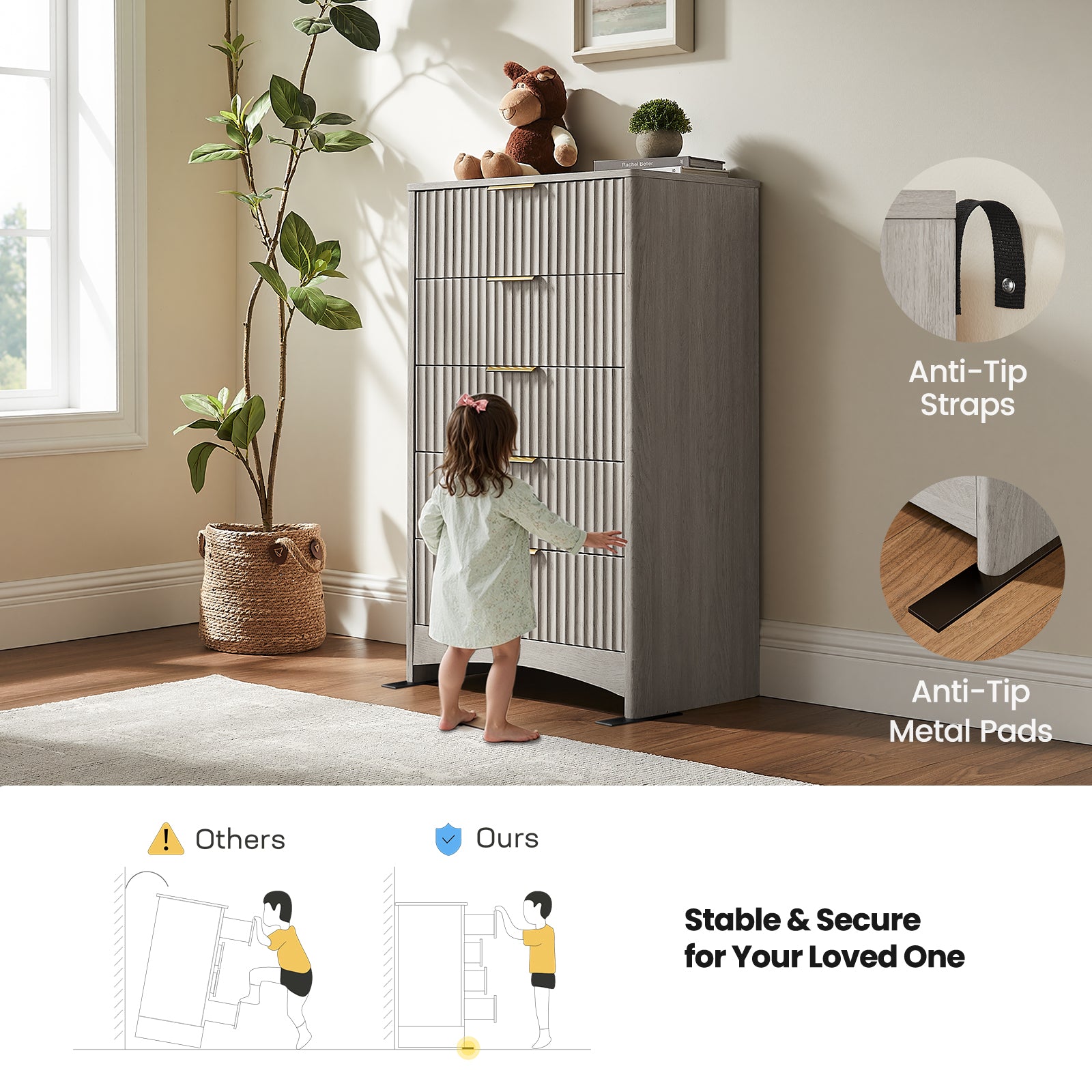 - Durable, Secure & Family-Safe: Crafted for everyday use, this solid wood tall dresser comes with an anti-toppling kit and a strengthened base for extra stability. Rounded edges shield children and pets, making it a reliable storage option for any household.