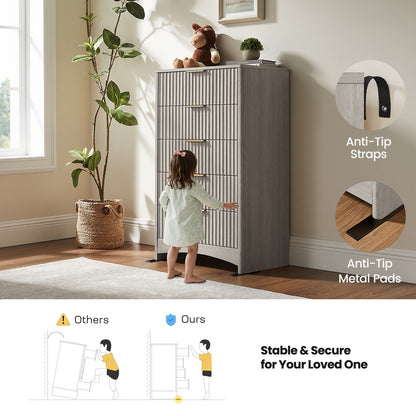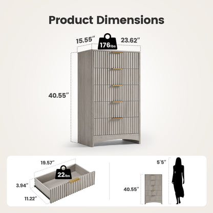 Tall 5 Drawer Dresser, Modern Fluted Vertical Chest with Rounded Corners, Pre-Installed Drawer Slides & Narrow Storage Design for Bedroom or Hallway in Natural Oak / Grey