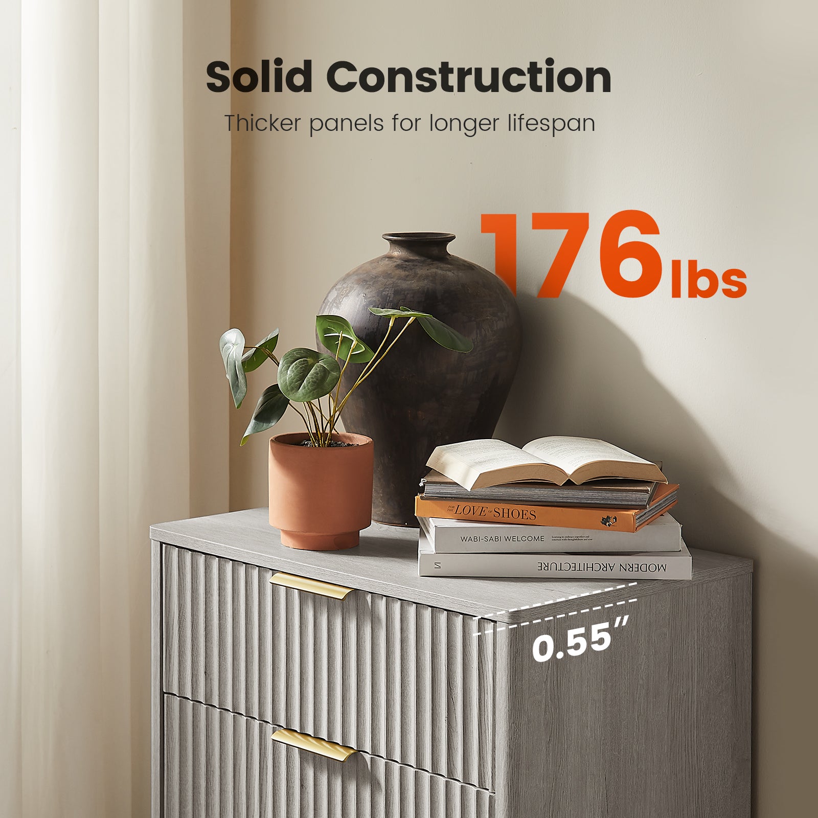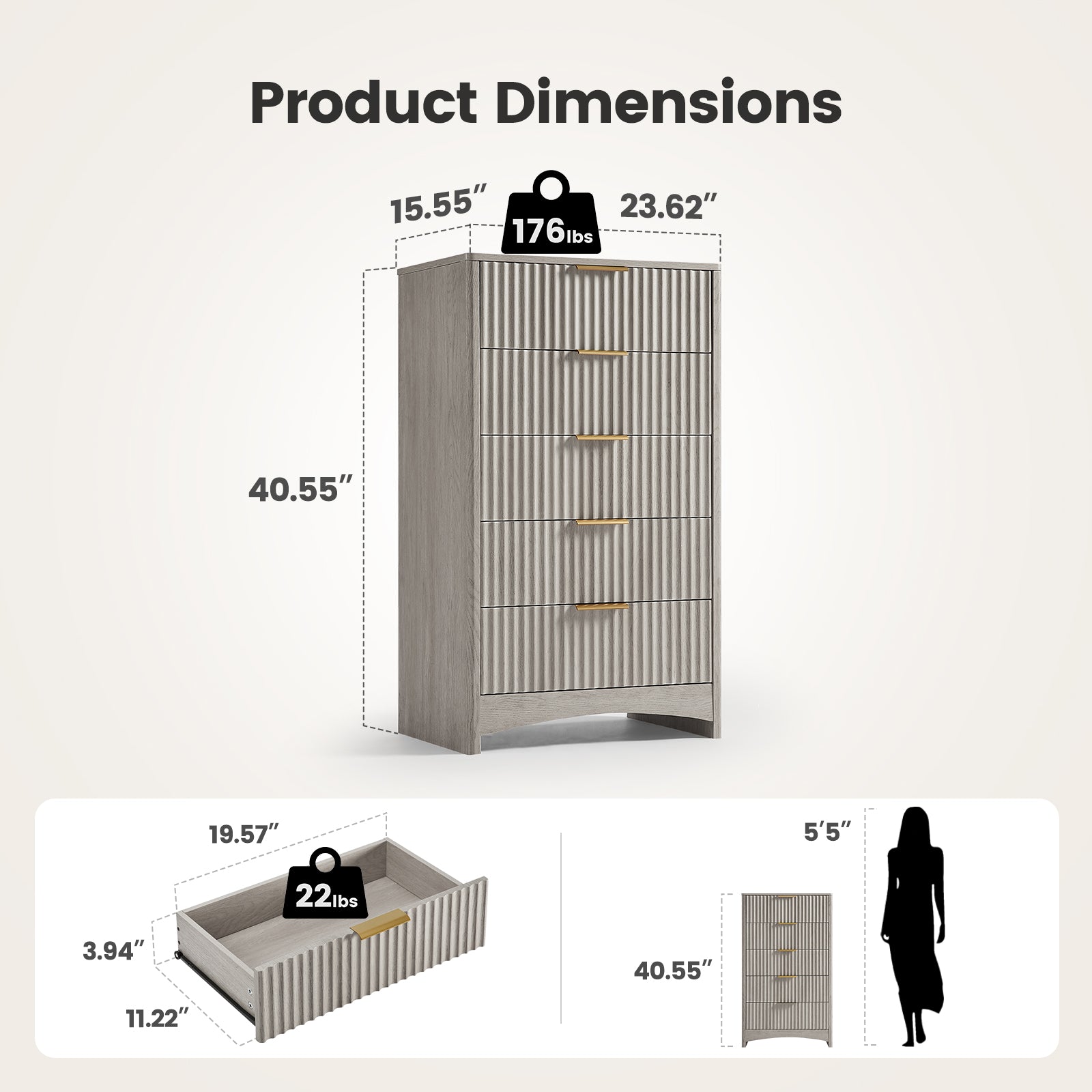- Graceful Fluted Detailing: Add contemporary texture and coziness to your space with this fluted 5-drawer dresser. Boasting wave-themed drawer fronts, smooth metal handles, and a natural oak coating, it’s a chic, space-efficient focal point for bedrooms, living rooms, or hallways.