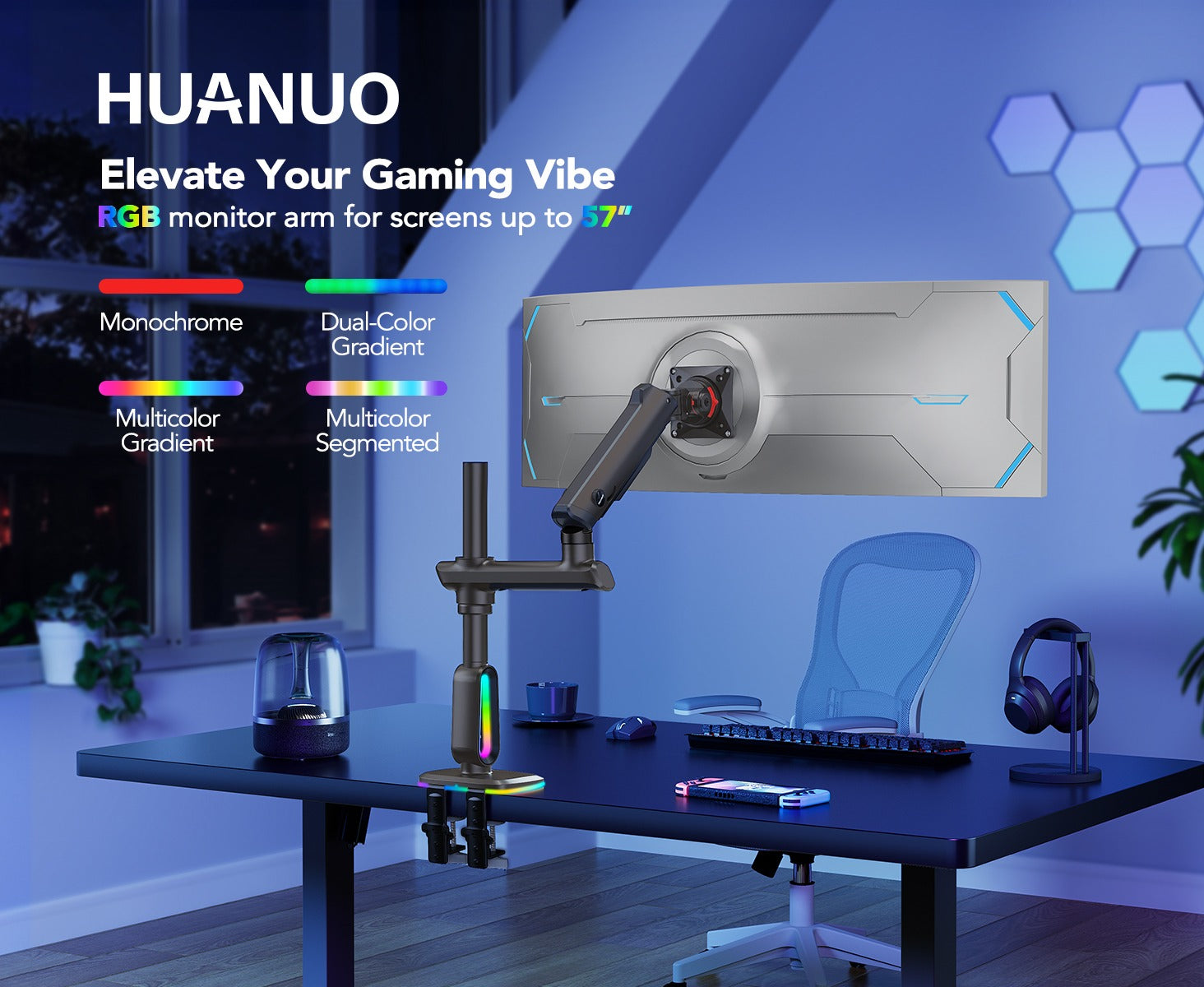 Take your gaming to the next level with the HUANUO RGB monitor arm, featuring 14 vibrant, customizable modes. Adjust the lighting to match your needs, creating an immersive and dynamic gaming atmosphere that enhances every session.