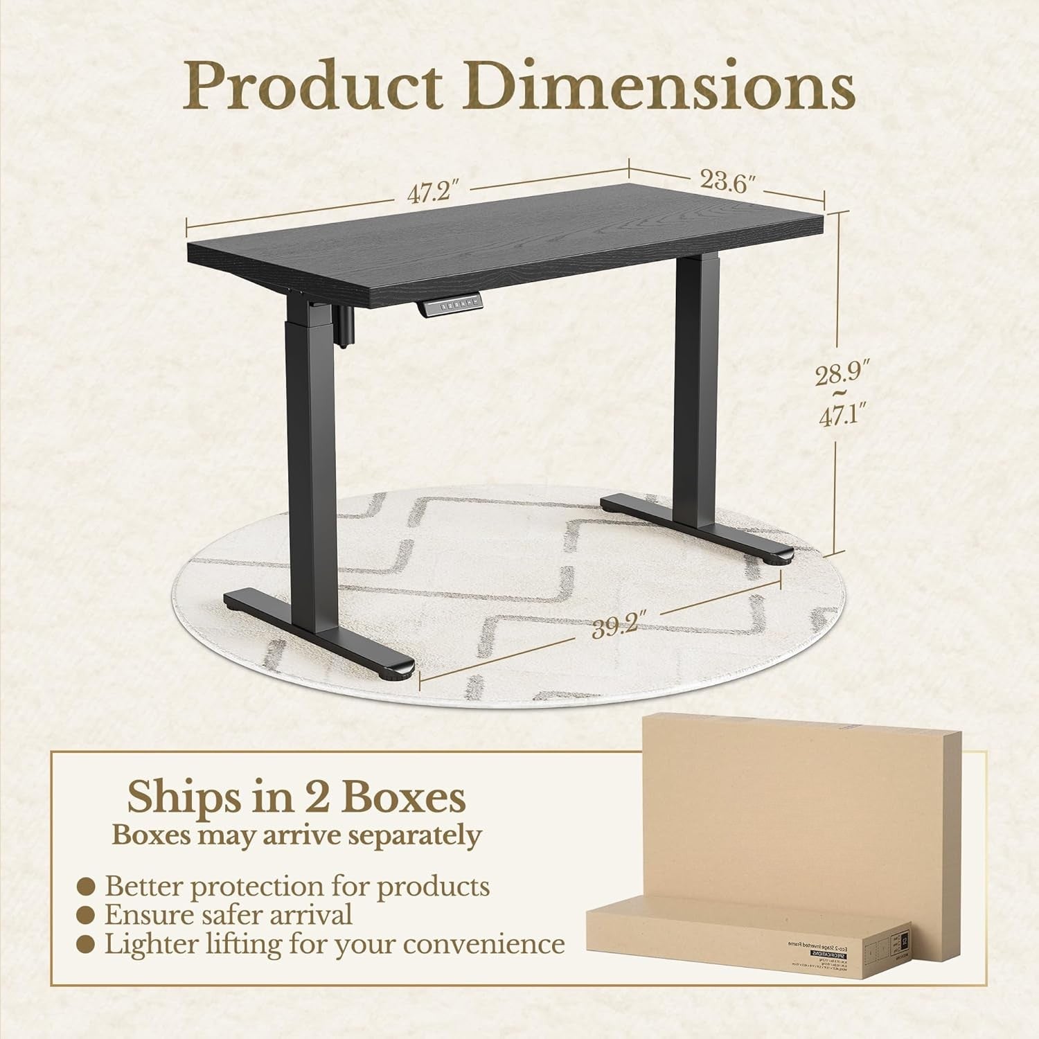 Featuring a spacious 47.2" × 23.6" desktop and a height range of 28.9"–47.1", this desk offers generous workspace and ergonomic flexibility. For safer delivery and easier handling, the desk ships in two separate boxes, ensuring better protection and a smoother setup experience.