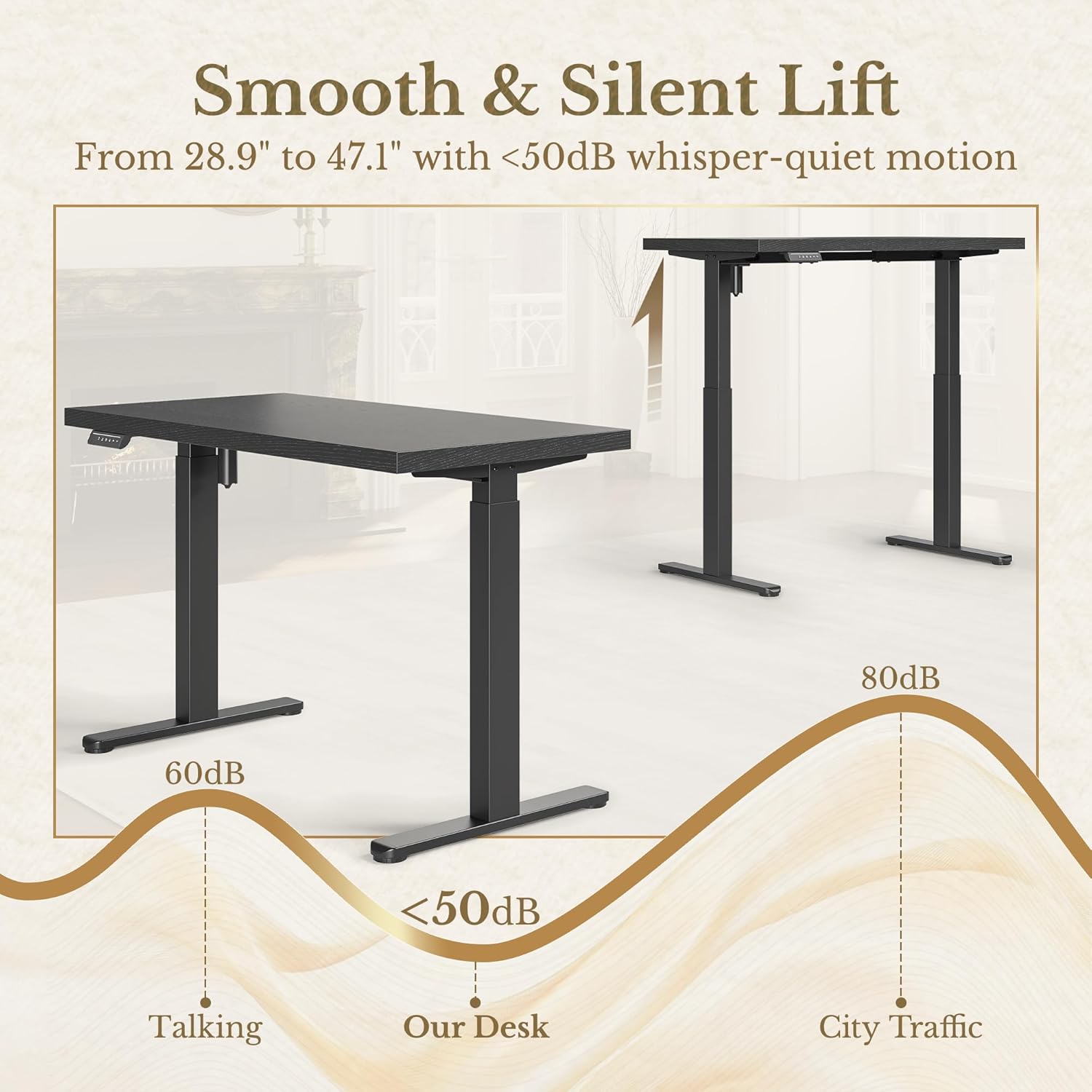 Enjoy height adjustments from 28.9" to 47.1" with whisper-quiet motion under 50dB—quieter than normal conversation. This smooth, low-noise lift system ensures seamless transitions without disrupting focus, work, or those around you.