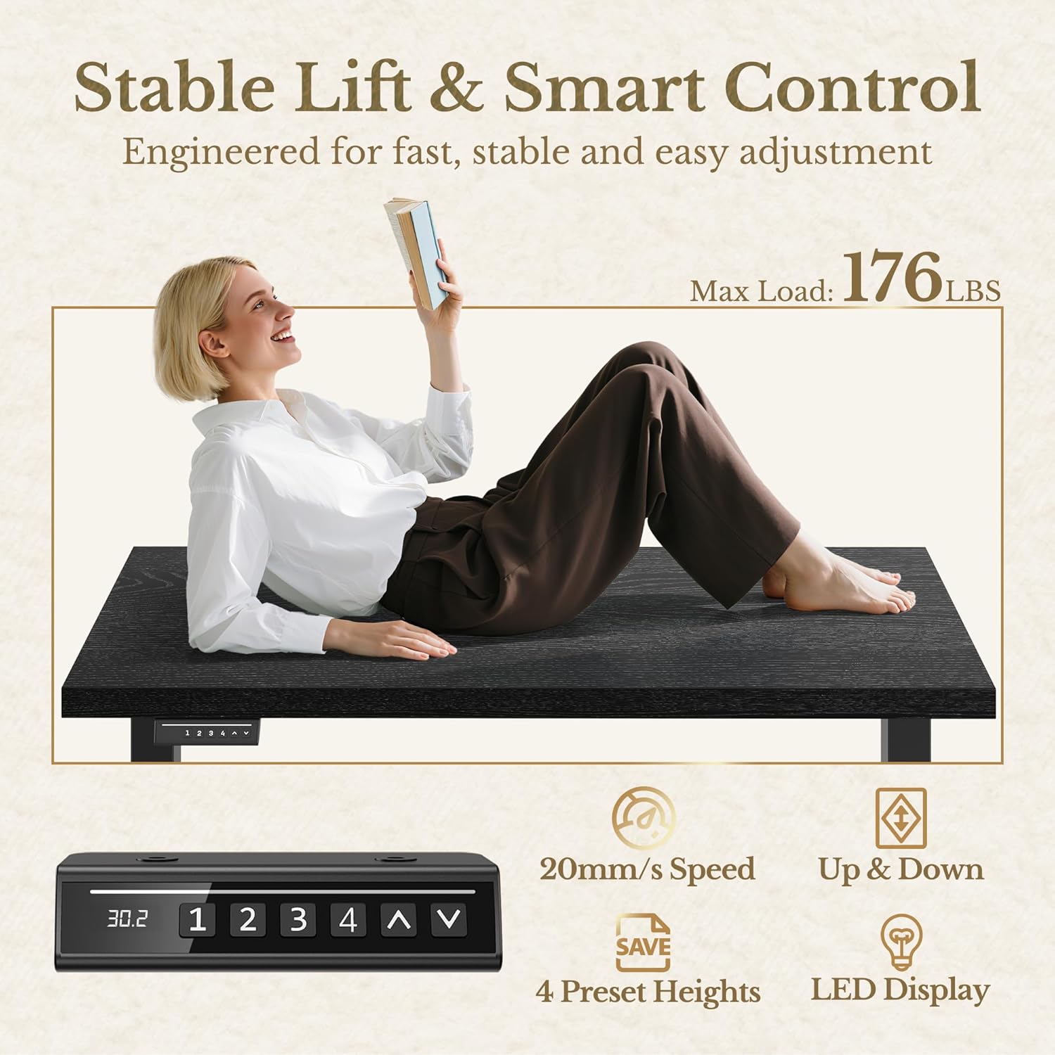 ▸ Rock-Solid Stability: Aerospace-grade lifting columns and reinforced steel legs ensure exceptional stability, even at full height. Rigorously tested through 100,000 lift cycles to stay wobble-free and secure for years of daily use.