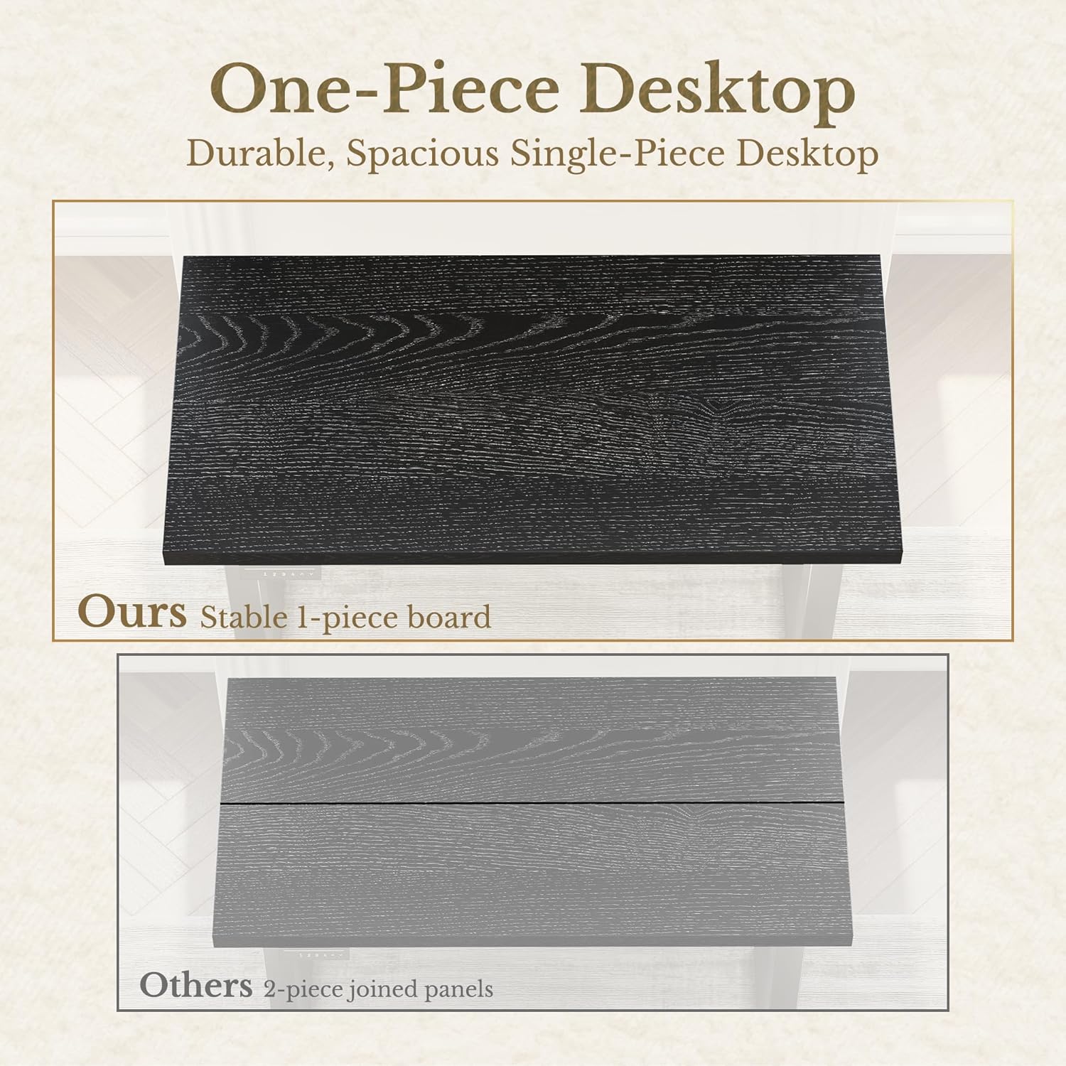 Experience a durable, spacious work surface crafted from a single solid board. Unlike traditional 2-piece joined panels that loosen or create gaps over time, our one-piece desktop delivers superior stability, a seamless appearance, and long-lasting strength for everyday use.