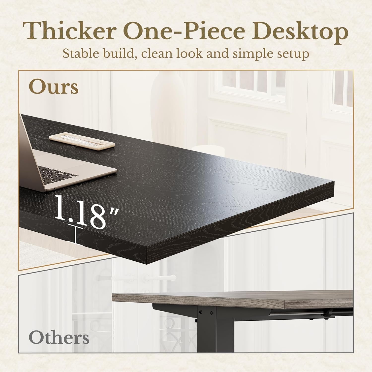 Crafted with a solid 1.18" one-piece desktop, this upgraded design offers superior strength, a cleaner aesthetic, and a more stable structure than standard spliced tabletops.