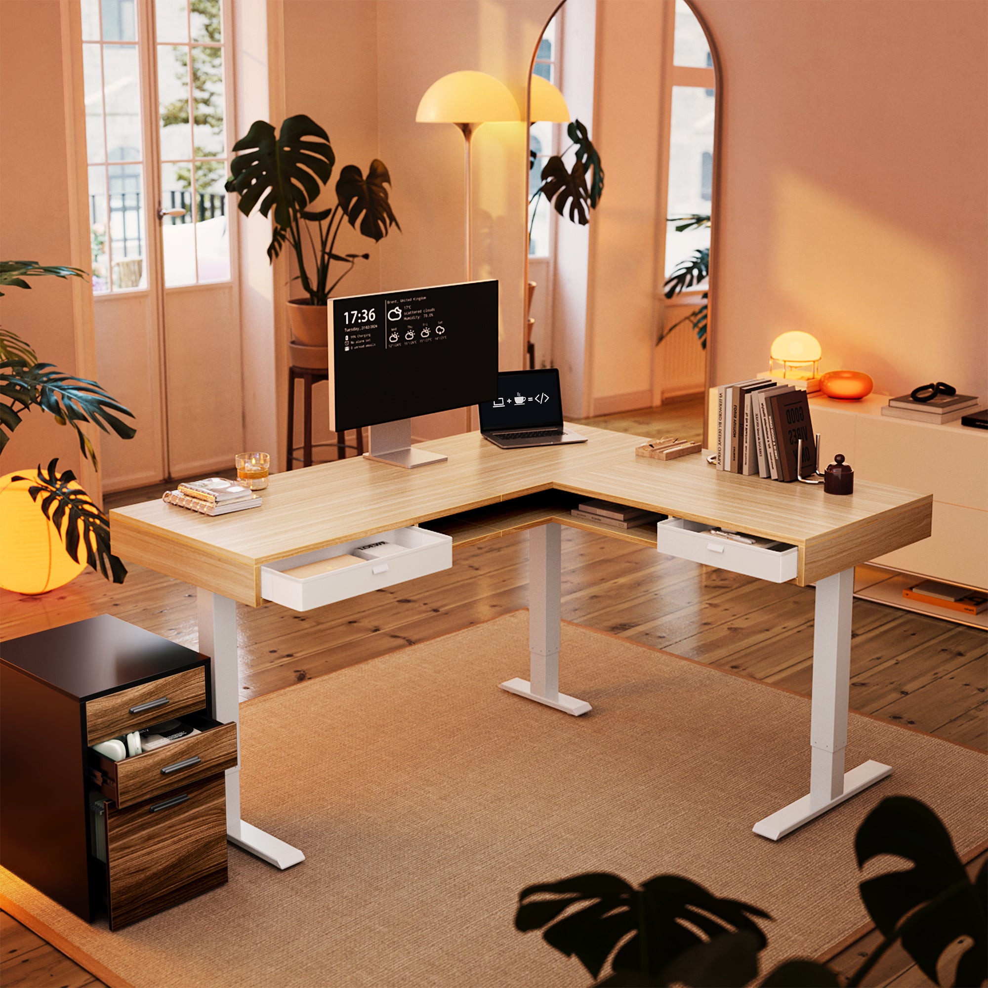 L-shaped electric standing desk with Storage Plus drawers, wide workspace and clean cable management.