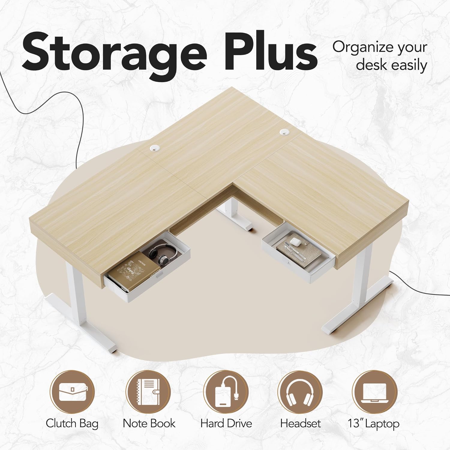 Say goodbye to desktop chaos. The Storage Plus system is designed to keep your workstation clean, intentional, and distraction-free. Two dedicated fabric drawers hold your clutch bag, notebooks, hard drives, headset, and even a 13" laptop, all neatly out of sight. Open upper compartments keep your daily essentials within easy reach so your workflow never slows down. With smart integrated storage solutions, clutter turns into clarity and focus becomes effortless.