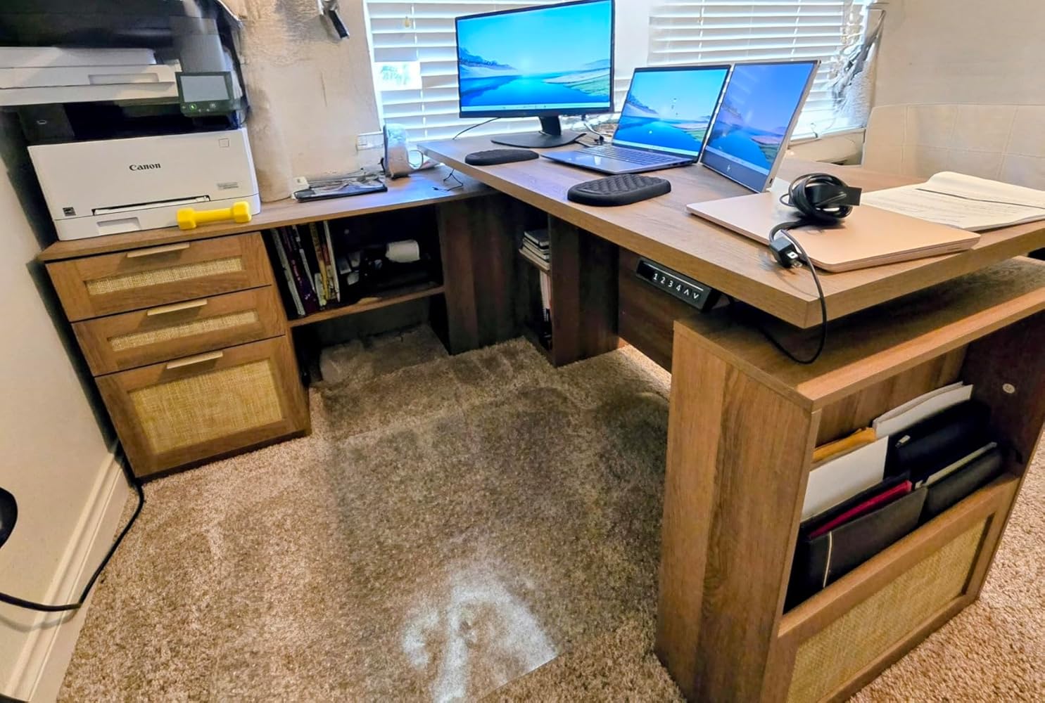 The I shaped executive standing desk with 2 drawers and 1 file cabinets, multi-sized storage cubby for your everyday it-pens, tools, books, or decor. The secondary desktop is equipped with AC/UB and can be used to place a printer or speakers.File cabinets feature dualrmat file rails that fit both A4 and Letter-size files.