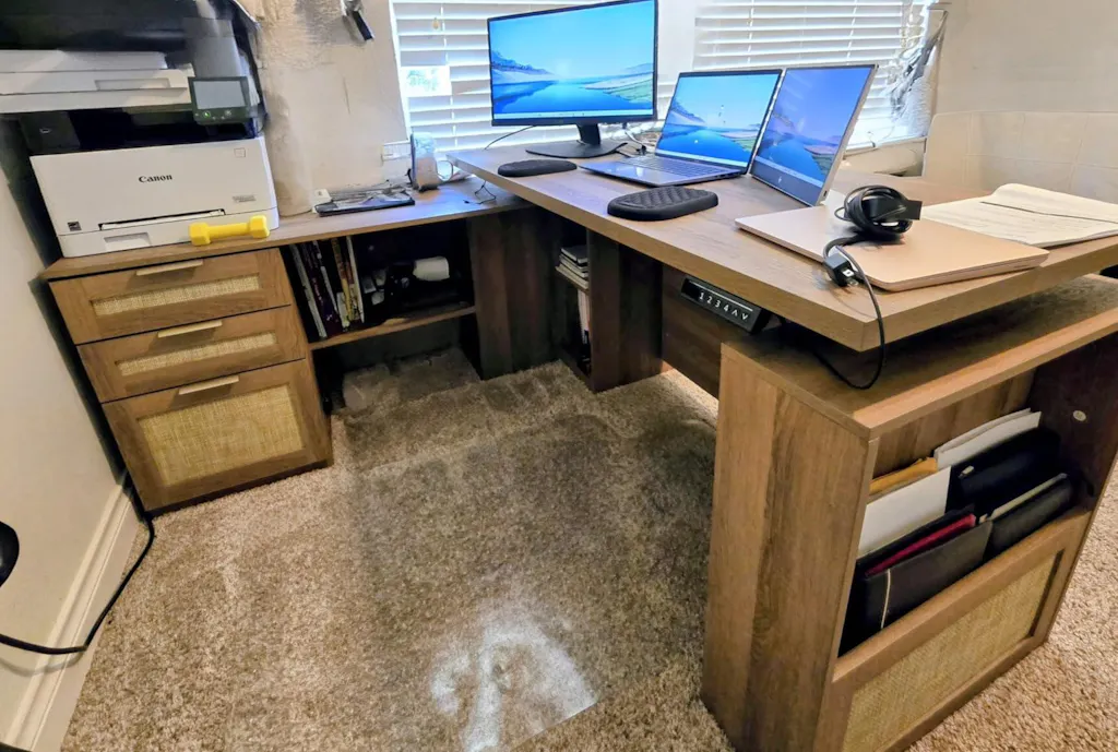 Ergonomic Home Office Desk:Electric standing desk has asturdy steel frame with aerospace-grade lifting column connectors (stillI stable & secure after testing 100,000 times). It's a firm foundation forwork, even at full height.