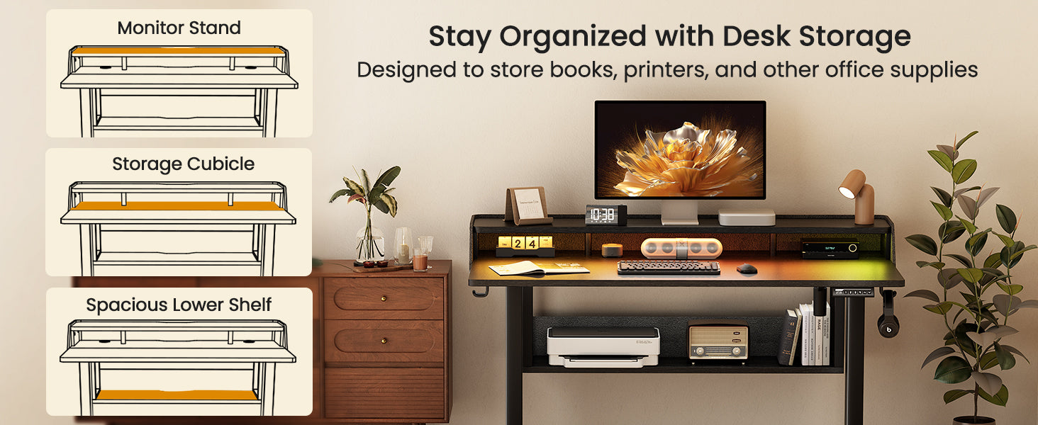 The standing desk with a bookshelf is designed with cable-friendly space for efficient wire management, keeping your setup neat, concealed, and organized.