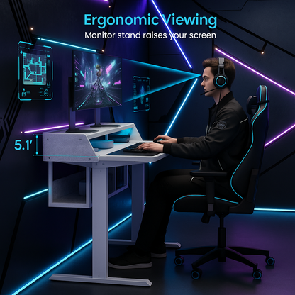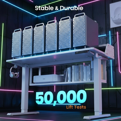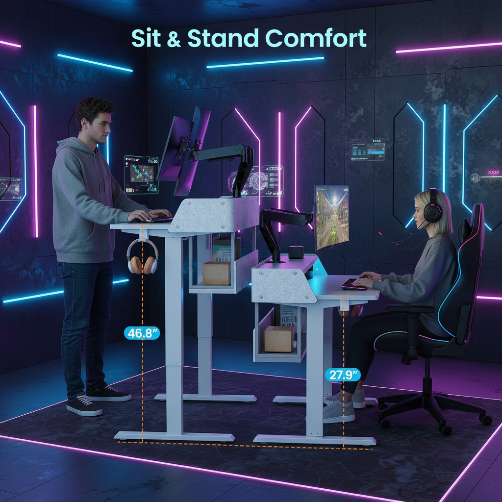 The standing gaming desk can transform any workspace with dynamic RGB lighting that offers 160,000 color options. Easily control the lights with the app or remote to adjust brightness, speed, or even sync with music. Create an immersive, personalized atmosphere to boost productivity.