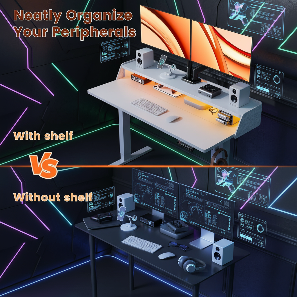 The top shelf backstop keeps books, monitors, or decor secure, while the 2 x storage hooks provide easy access to headphones, bags, or charging cables. Stay tangle-free with 2 x cable holes for seamless wire management, keeping your workspace clean and professional. this desk helps you stand tall, work better, and stay organized—whether you're working, gaming, or creating.