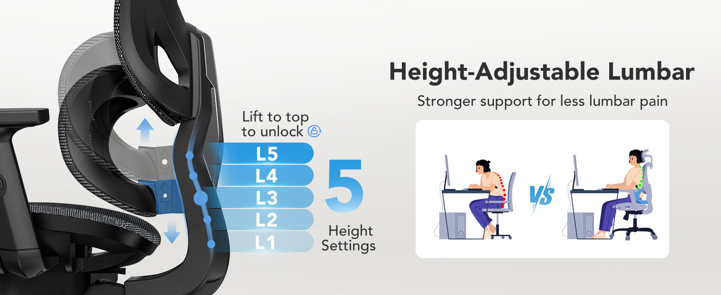 Experience next-level comfort with our professional ergonomic chair featuring 5-level height adjustment (activated by lifting to the top position to unlock). The height-adjustable lumbar system provides targeted support that adapts to your spine's natural curve, delivering stronger reinforcement where you need it most to significantly reduce lumbar pain.