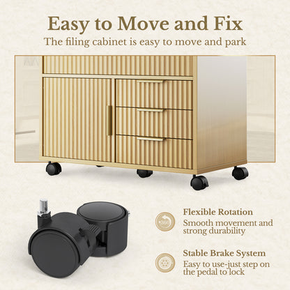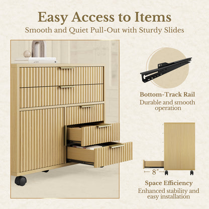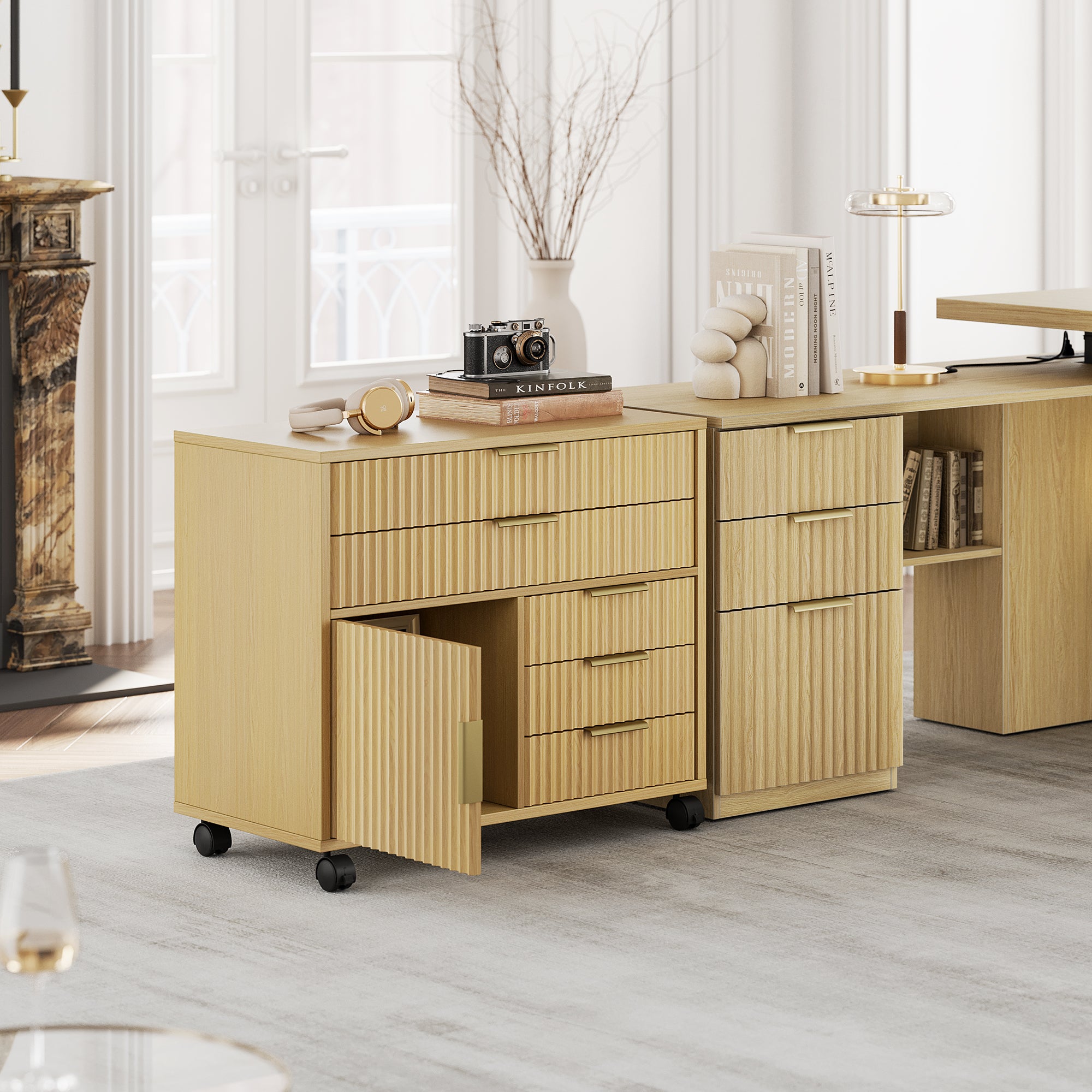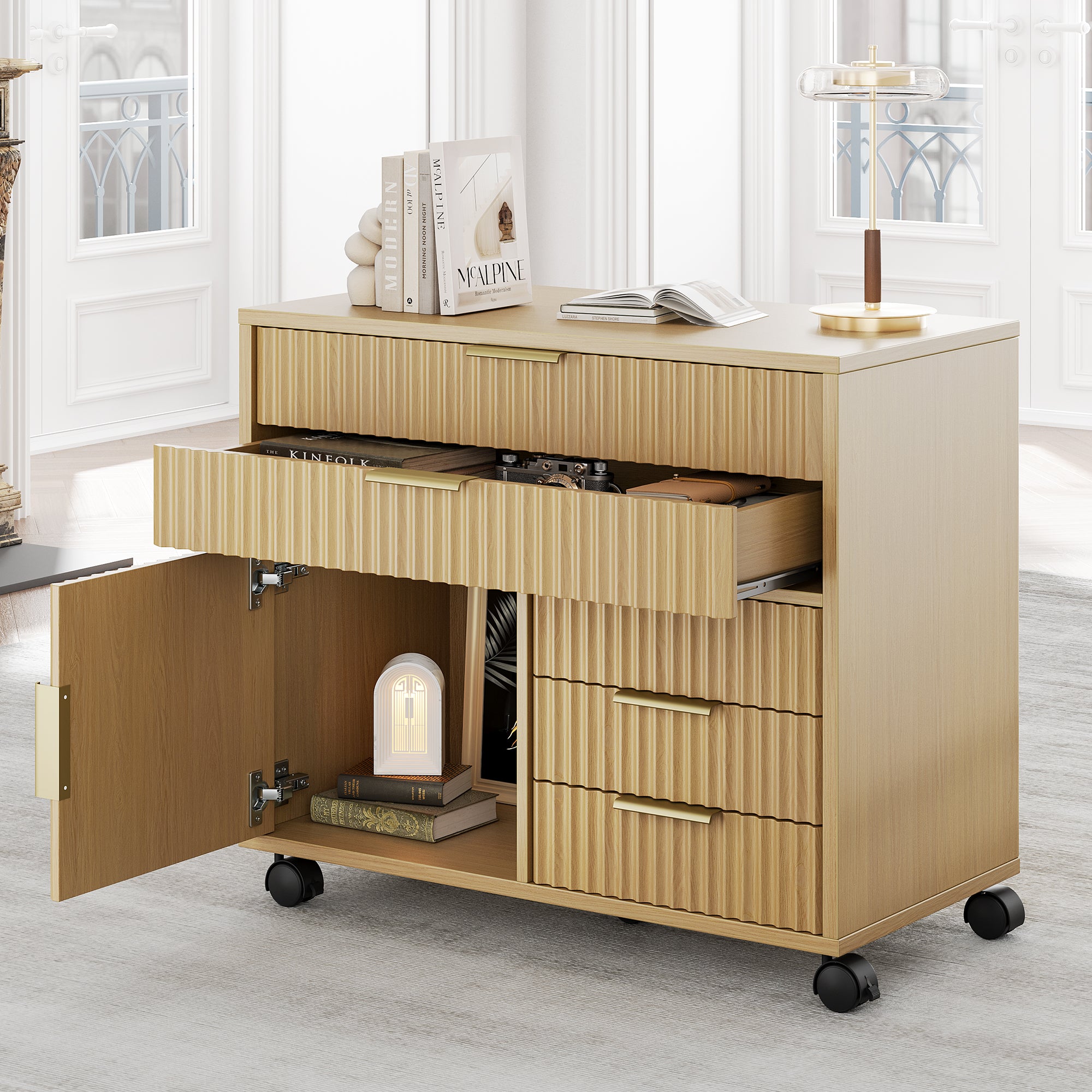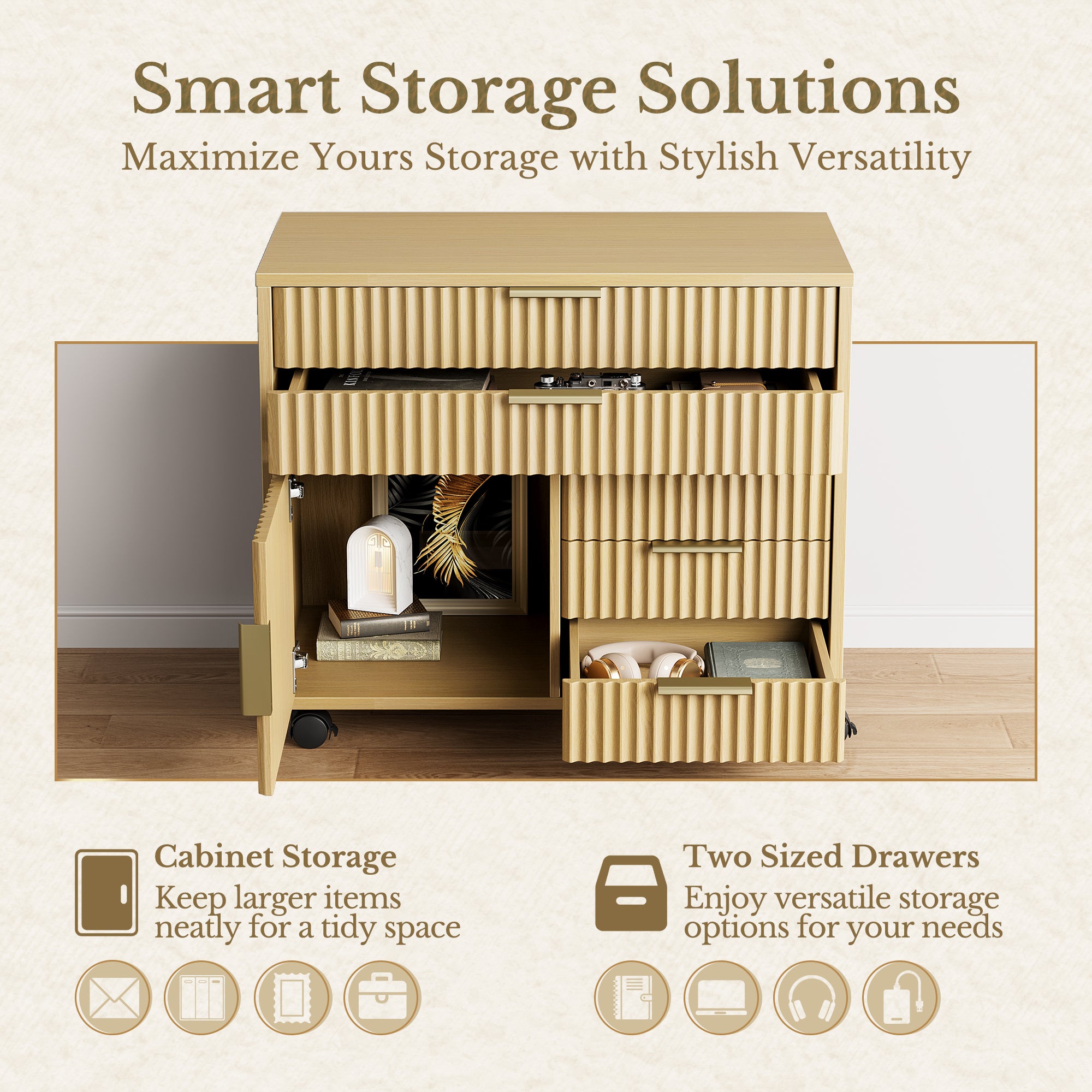 - Mixed storage layout: 2 wide top drawers, 3 right‑side drawers, plus a left door cabinet for bulkier items.