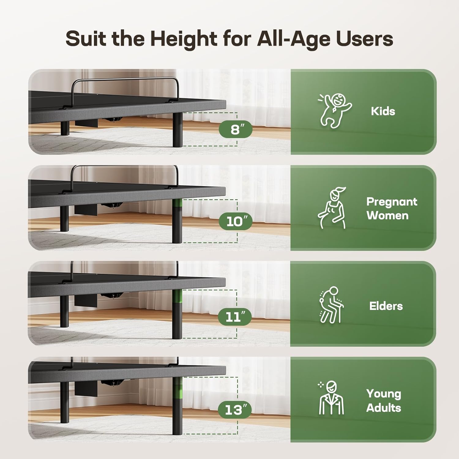 The head of the adjustable bed base inclines up to 65° while the foot section can raise to 45° for perfect sleep positioning. Find the ideal angle to rest comfortably with less snoring and back pain. Choose from four height options between 8″ and 13″ using the included screw-on legs.
