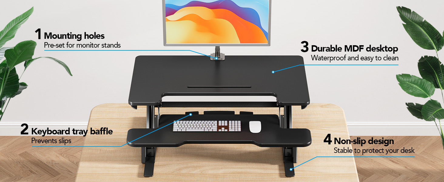- Easy Transitions: With smooth dual gas spring lifting, you can go from sitting to standing in seconds. The stand up desk riser delivers smooth, quiet, and stable lifting. Built to last, the gas springs are tested for over 20,000 lift cycles to ensure long-term durability and dependable daily performance.