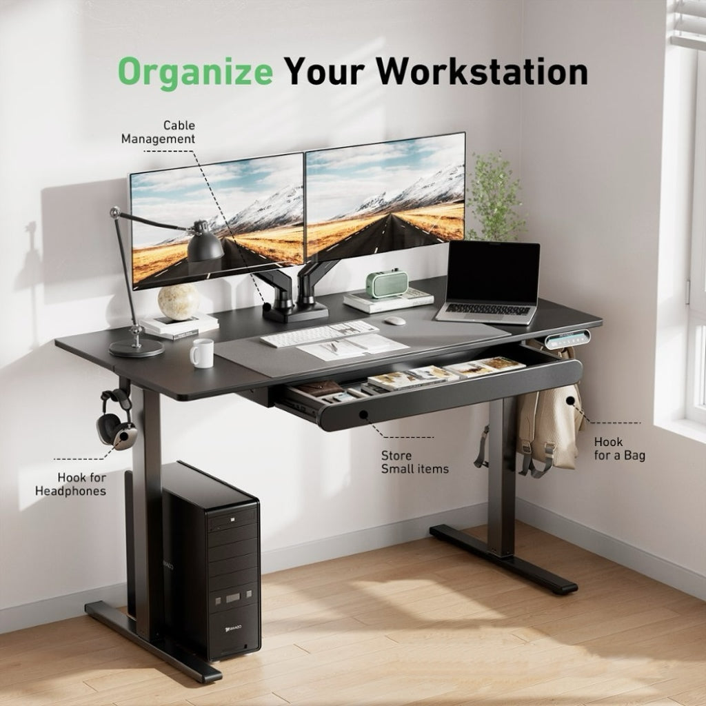 Organize Your Workspace: Keep your workspace tidy and efficient with handy features like a large storage drawer for small items, dual hooks for your bag and headphones, and an integrated cable management system. Enjoy a clutter-free desk that promotes productivity.