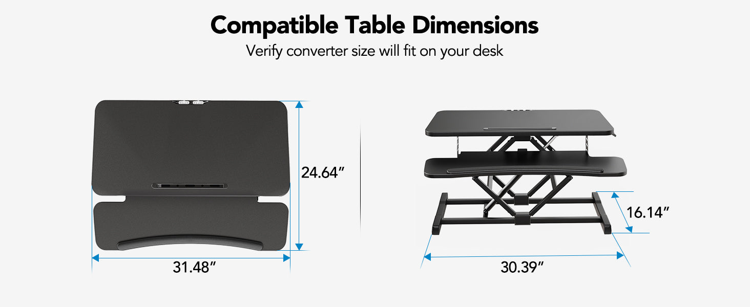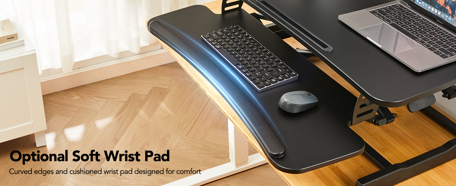 - Ergonomic Design: The desk converter has curved edges and an optional cushioned wrist pad to provide comfortable typing. Built-in cable management clips on the back of the desktop allow you to neatly route wires for a tidy look which increases productivity and improves focus!