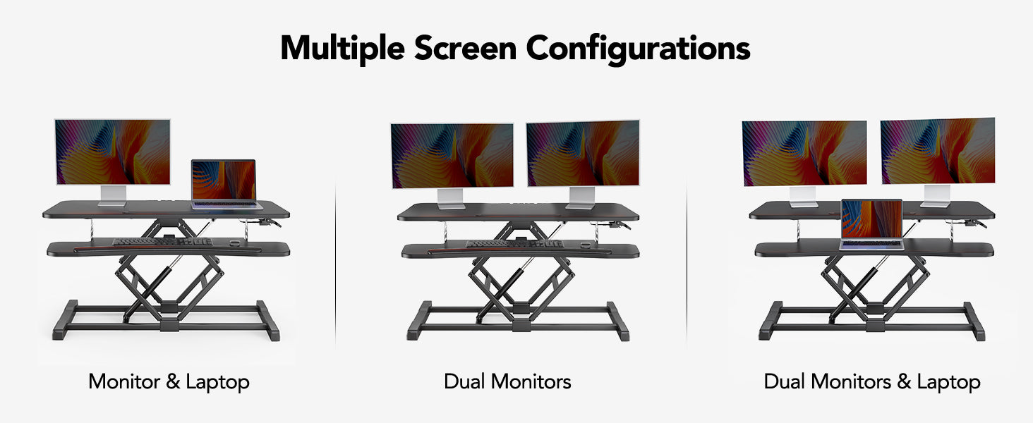 - Adjustable Height Range: This standing desk converter is designed to lift your screen to an ergonomic height, helping to avoid muscle tension and body strain while increasing productivity. Customize your workspace from 4.7″ to 18.1″ tall above a sitting or standing desk for ultimate comfort (Please refer to the product description for compatible table types and sizes)