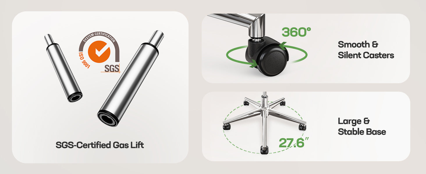 Built for seamless movement, this sturdy chair base combines an SGS-certified gas lift for smooth height adjustment with ultra-quiet casters that glide effortlessly on hard floors. The oversized 5-point base delivers exceptional stability, while reinforced nylon construction ensures durability. Perfect for offices, conference rooms, or home workspaces where quiet operation and reliability matter.
