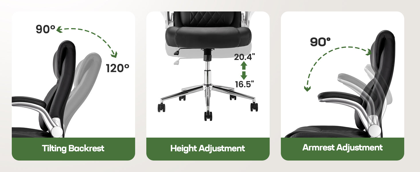 Engineered for total comfort, this chair features a 90°-120° tilting backrest for optimal recline, 16.5"-20.4" seat height adjustment to fit any desk, and 90° adjustable armrests for perfect arm support. The synchronized adjustments let you customize every angle for work or relaxation, reducing strain during long hours. Ideal for office, gaming, or home use.