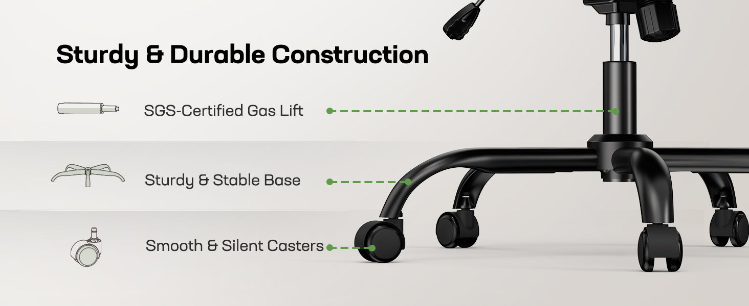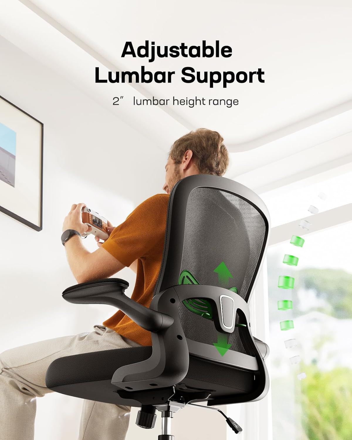 Experience unmatched comfort with our ergonomic office chair, designed for all-day support and customizable adjustments. Featuring 2" lumbar support adjustment, you can fine-tune lower back relief for optimal posture. The seat height adjusts from 18.5" to 22.4", ensuring perfect alignment with your desk, while the 90° armrest adjustment allows for relaxed shoulders and reduced strain.