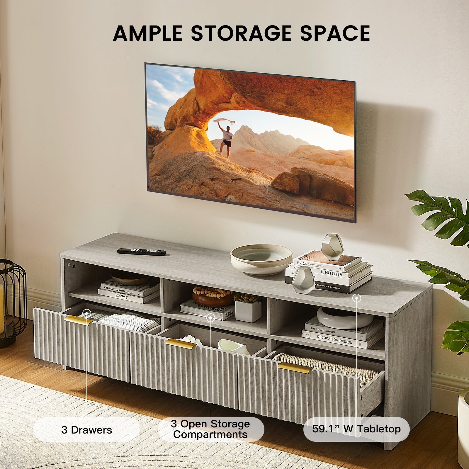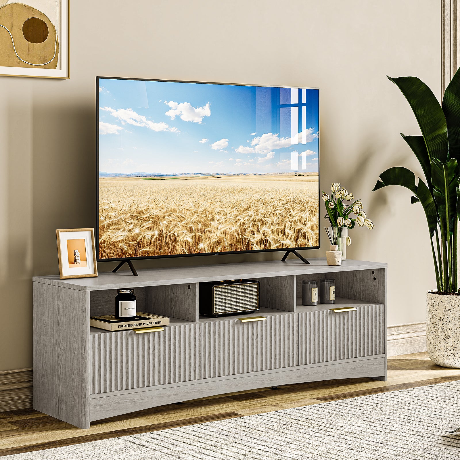 - Fits TVs Up to 65 Inches - Designed to support TVs up to 65 inches, this 59" TV stand offers a well-balanced size that fits perfectly in living rooms, bedrooms, or entertainment spaces. The wide tabletop provides stable support for your TV, soundbar, and décor—ideal for movie nights or gaming setups.