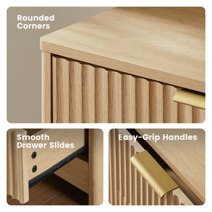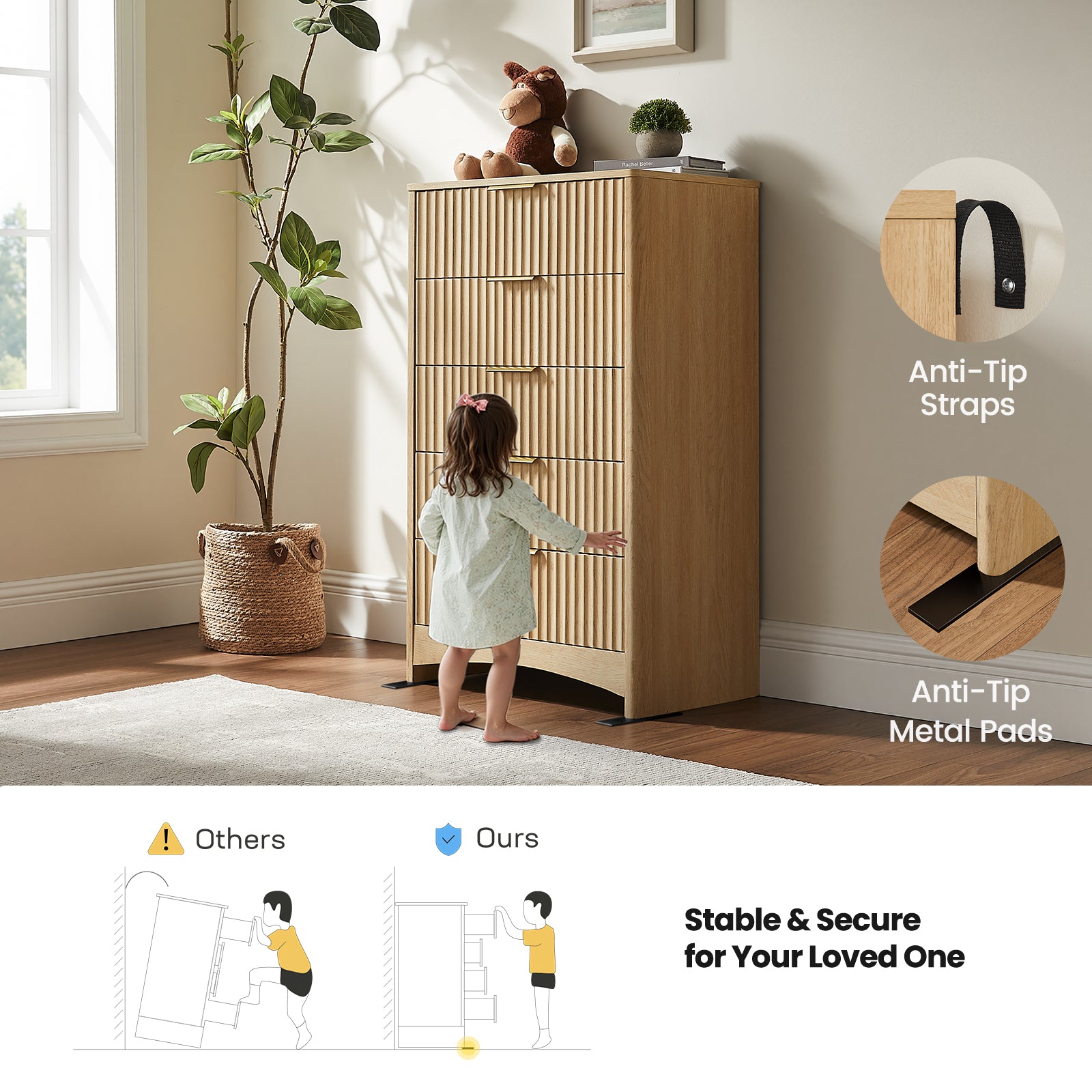 - Graceful Fluted Detailing: Add contemporary texture and coziness to your space with this fluted 5-drawer dresser. Boasting wave-themed drawer fronts, smooth metal handles, and a natural oak coating, it’s a chic, space-efficient focal point for bedrooms, living rooms, or hallways.