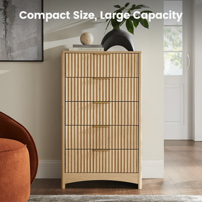 Tall 5 Drawer Dresser, Modern Fluted Vertical Chest with Rounded Corners, Pre-Installed Drawer Slides & Narrow Storage Design for Bedroom or Hallway in Natural Oak / Grey