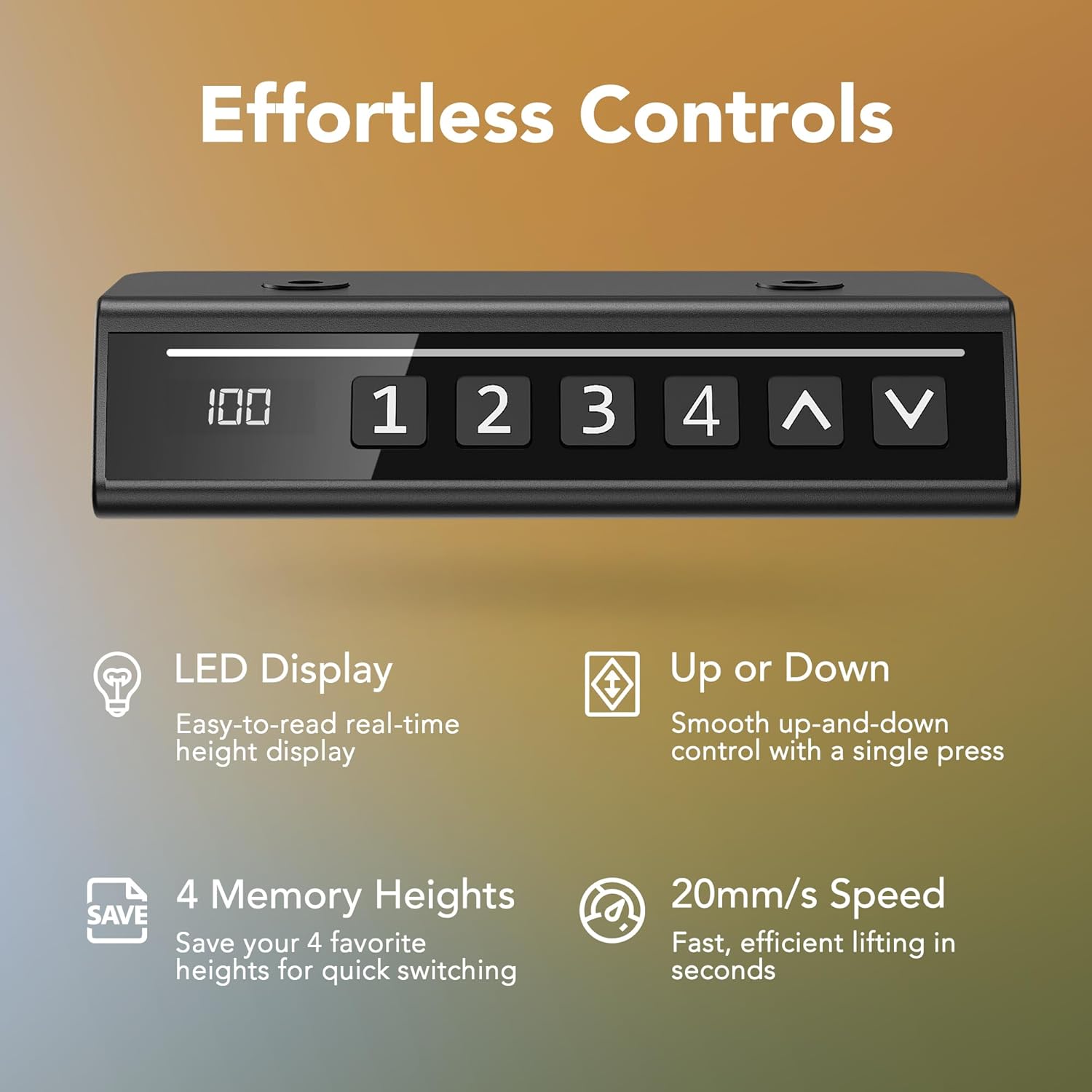 - 4 Custom Height Settings: Store custom sitting & standing heights for different users (or different use scenarios). Get the right height with a single button press.