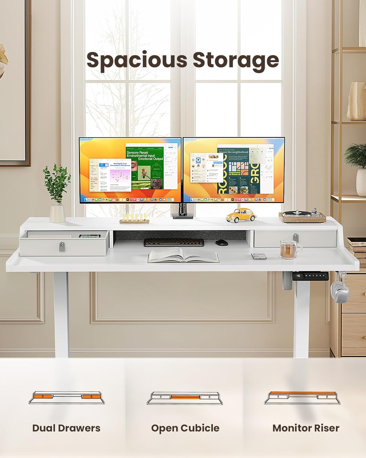 Storage-First Design: Featuring dual drawers, a built-in monitor riser, and an open cubby space—everything has its place.